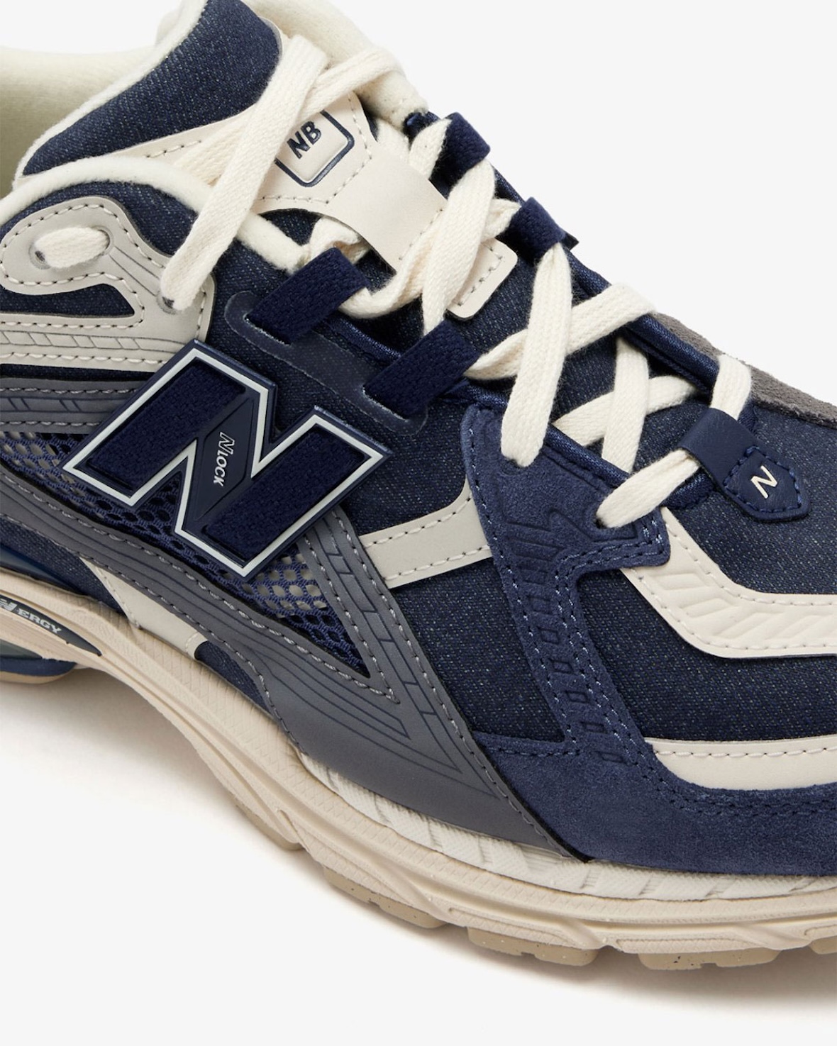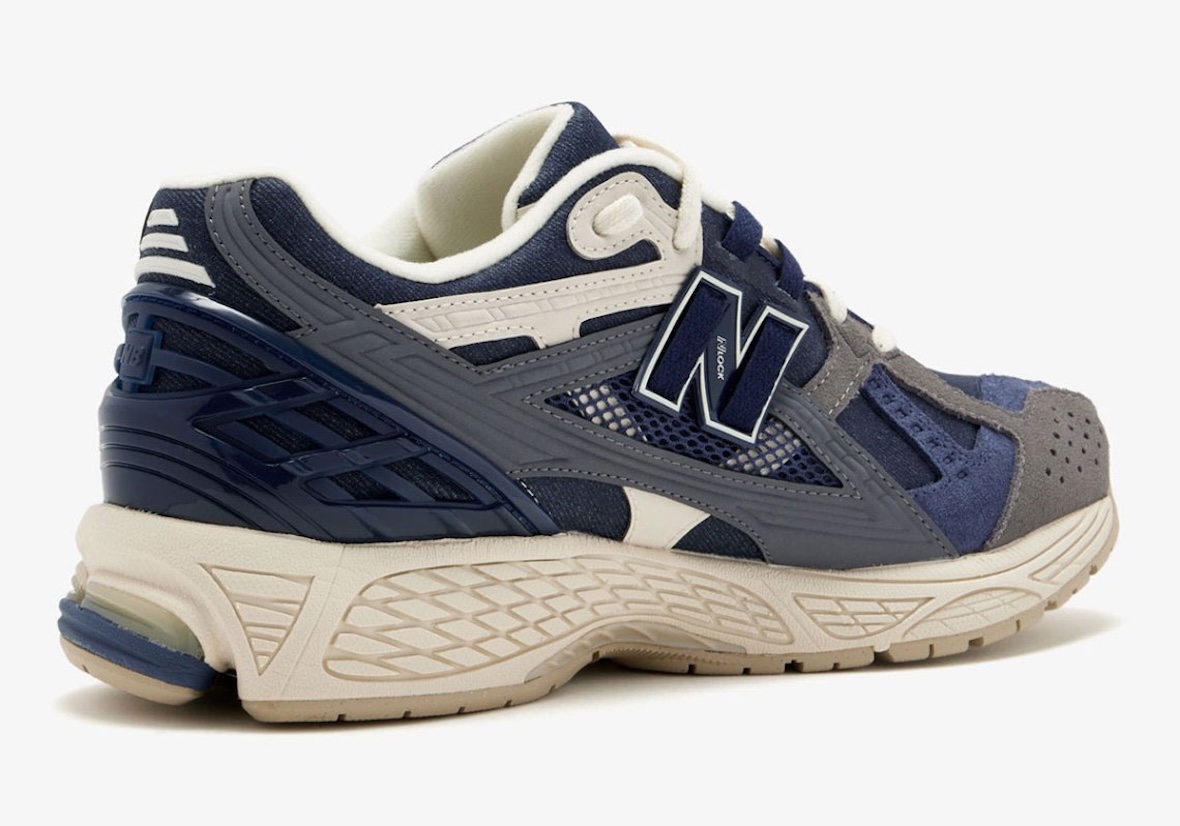 Mesh runs through the base, but it’s the layering that gives this pair its identity. Navy sets the tone across most of the upper, while grey panels cut through the midfoot and wrap the heel with a more structured feel. Off-white details show up along the lining and laces, breaking things up just enough without pulling attention away from the overall balance.