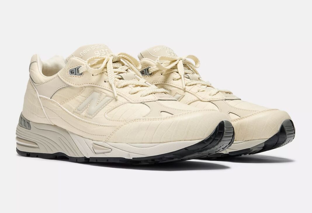 This iteration plays heavily on the use of different textures. The upper boasts a crocodile inspired texture that stretches throughout for cohesion and offers a bolder personality to the vintage silhouette than we’ve seen on other 991 models thus far. Panels of pistachio shades found on the toe cap and heel contrast the rest of the shoe, while a muted off-white “N” logo featured on the lateral wall balances the colour blocking.