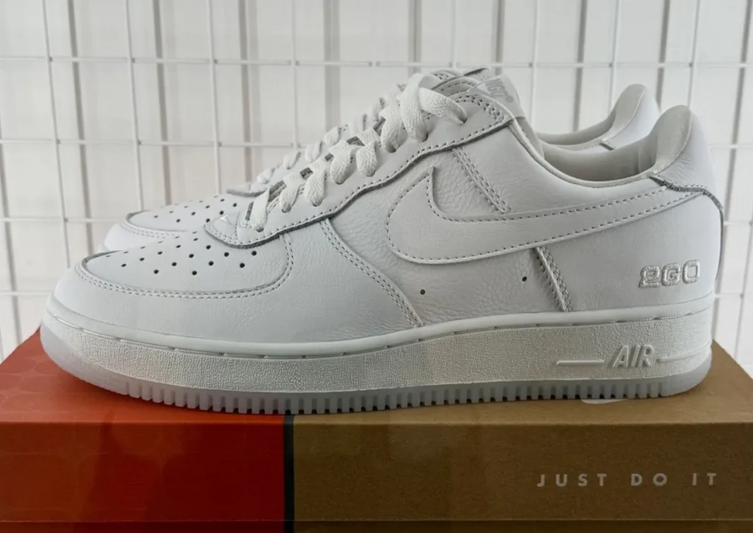 The sneaker arrives in a full Triple White color scheme with smooth leather across the upper, matching white laces, and tonal Nike branding. Its only major design twist appears on the heel, where “2GO” embroidery adds a subtle NIGO reference. The “2” works as a play on “Ni” in Japanese, giving the branding a personal touch without changing the clean look.