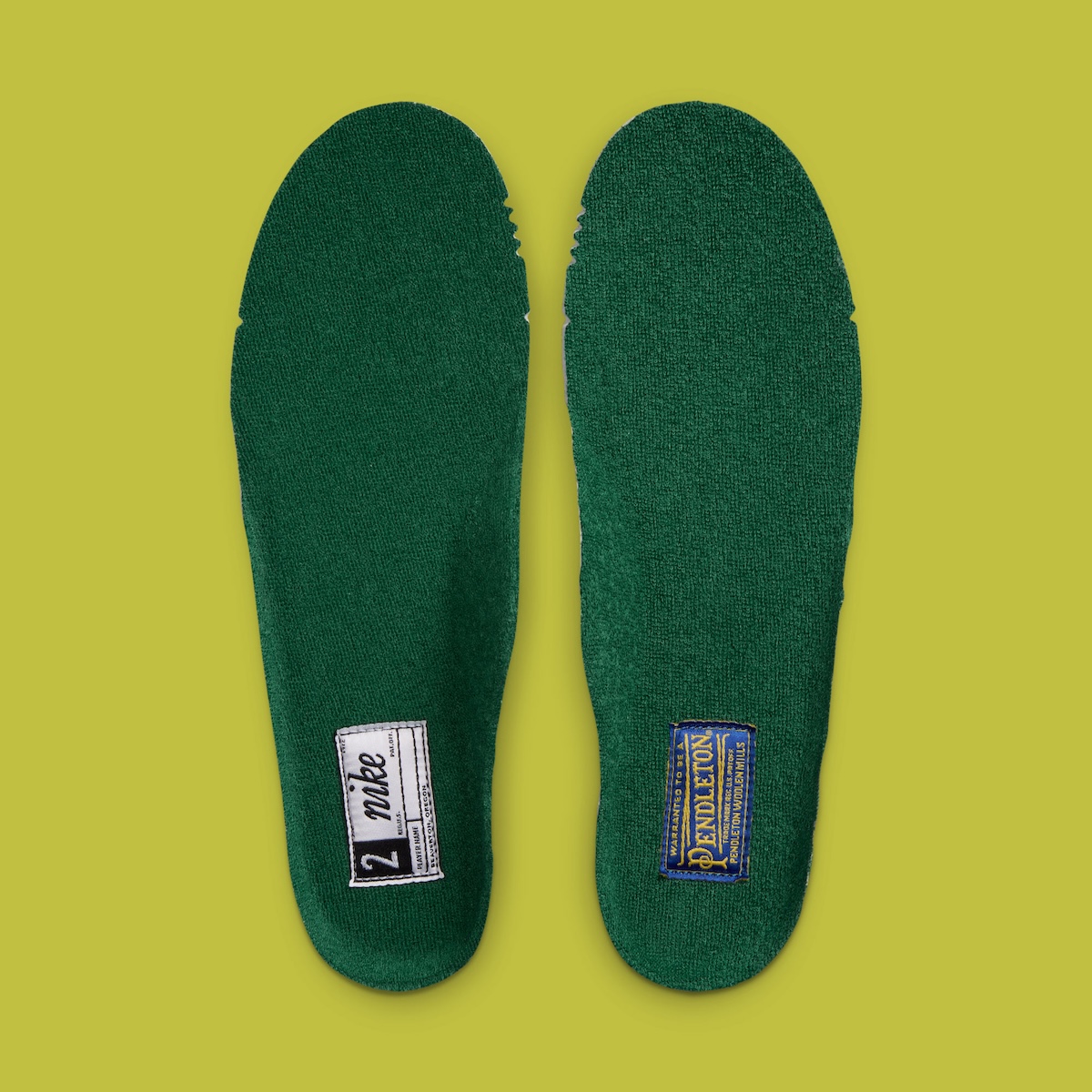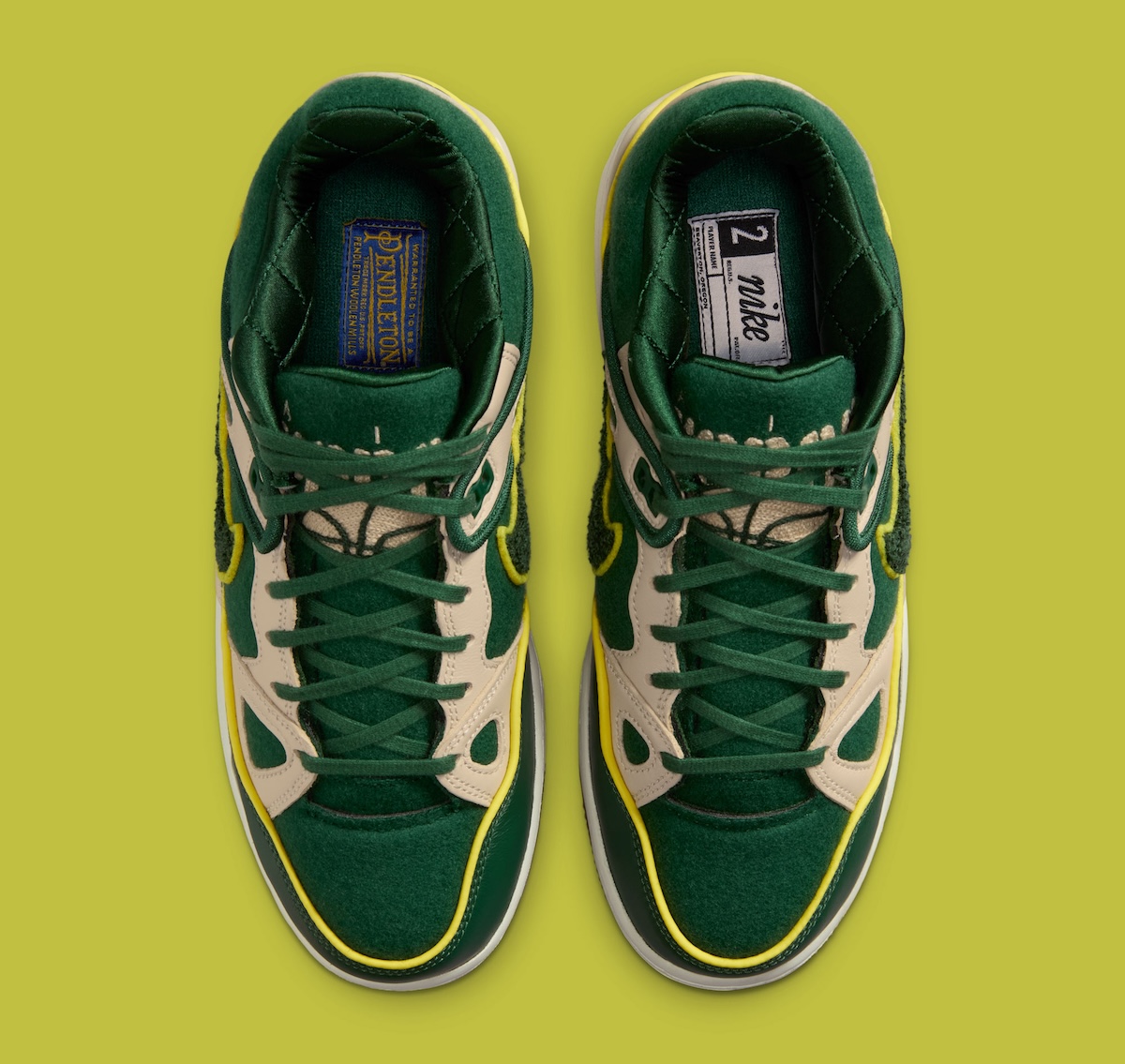 The construction balances texture and structure. Green leather panels anchor the toe and heel, while forest green Pendleton wool brings depth across the upper. Yellow piping sharpens each transition, and tan leather supports frame the sides. The wool Swoosh outlined in yellow feels deliberate rather than decorative.