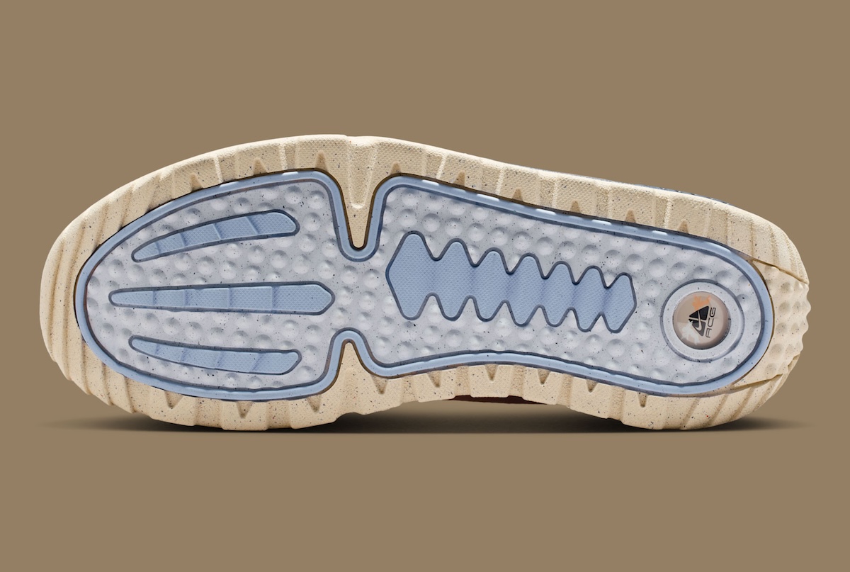 Underneath, things shift. A Diffused Blue midsole introduces contrast and structure, while the speckled outsole adds a trail-ready edge. Textured pods and rugged tread patterns suggest grip and stability, reinforcing ACG’s outdoor roots without pushing the model into performance territory.
