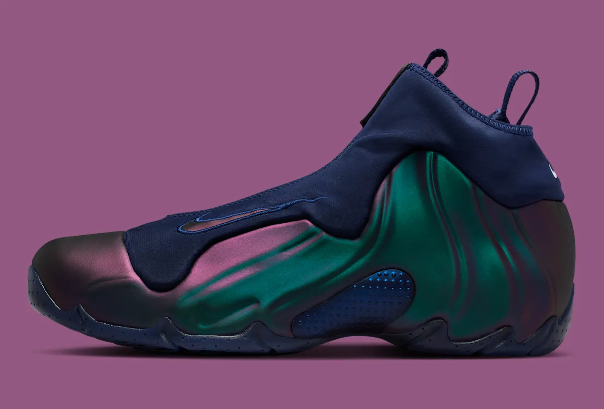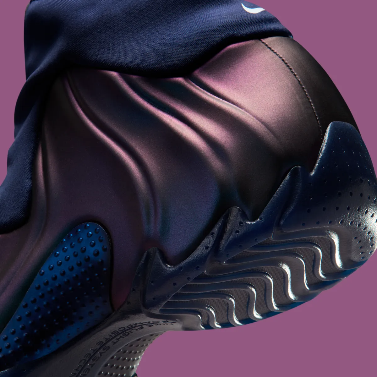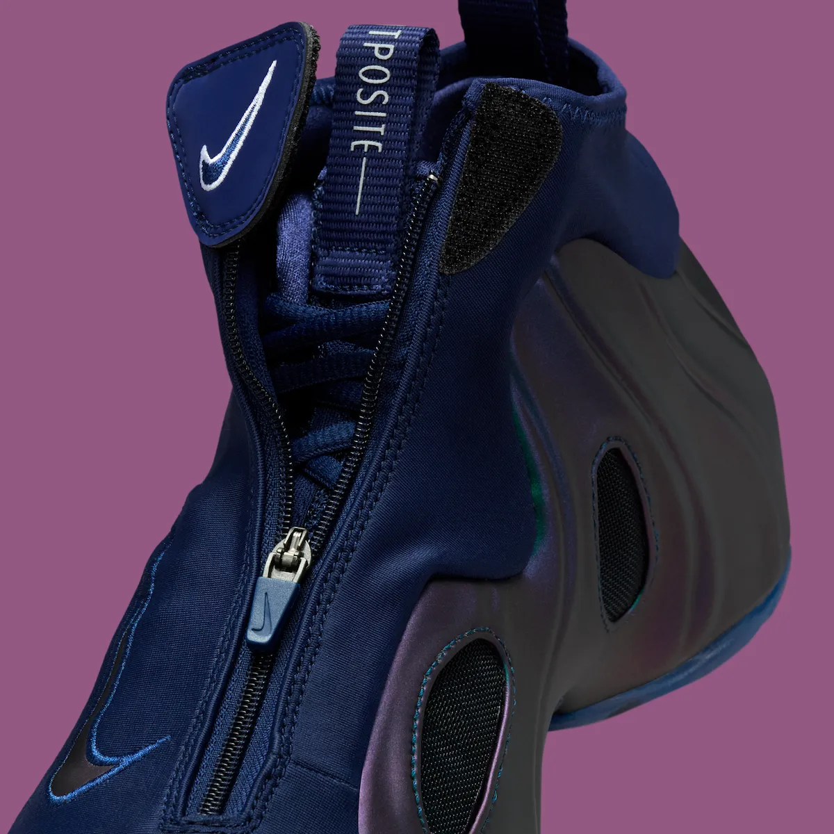 The sneaker features a striking iridescent Foamposite upper that shifts between deep purple and green tones. Midnight Navy covers the zippered shroud, neoprene tongue, and outsole for a sharp, futuristic contrast. A mini Swoosh and carbon fiber midfoot plate complete the bold design.