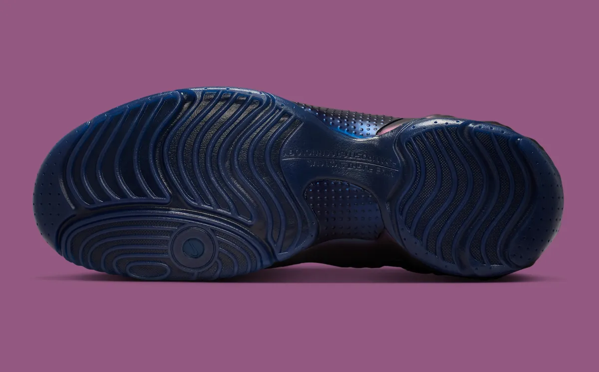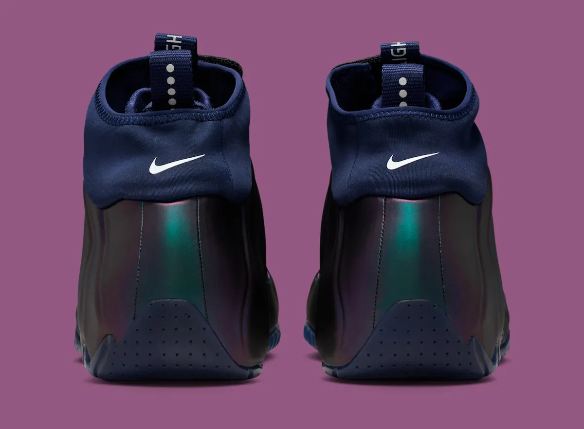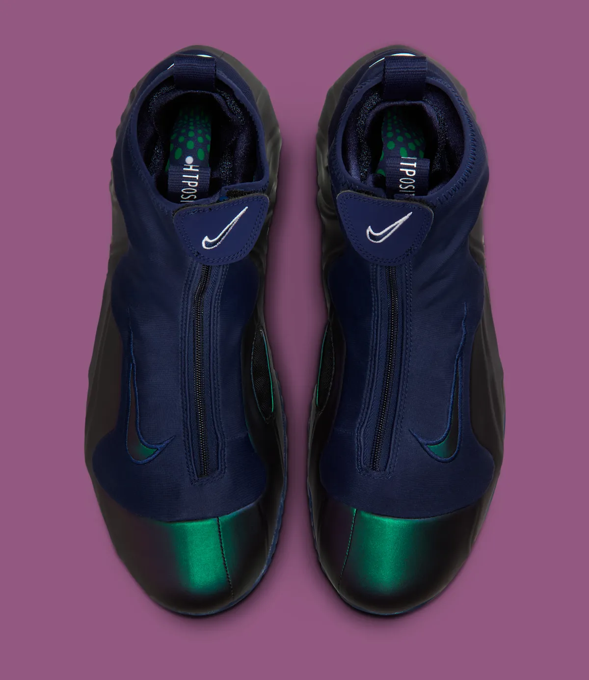 The sneaker features a striking iridescent Foamposite upper that shifts between deep purple and green tones. Midnight Navy covers the zippered shroud, neoprene tongue, and outsole for a sharp, futuristic contrast. A mini Swoosh and carbon fiber midfoot plate complete the bold design.