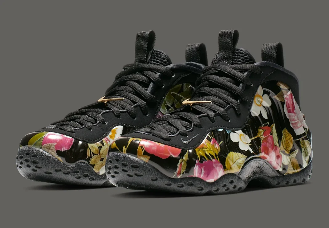 A faithful approach appears to be the plan rather than a reinterpretation. The pair keeps its glossy black molded shell as the canvas for a multi-color rose-and-leaf print that wraps the entire Foamposite upper, sitting in sharp contrast to the silhouette’s typically minimal palette. Black nubuck framing, a mesh tongue, tonal laces, and matching hardware preserve the original balance between performance build and visual drama.
