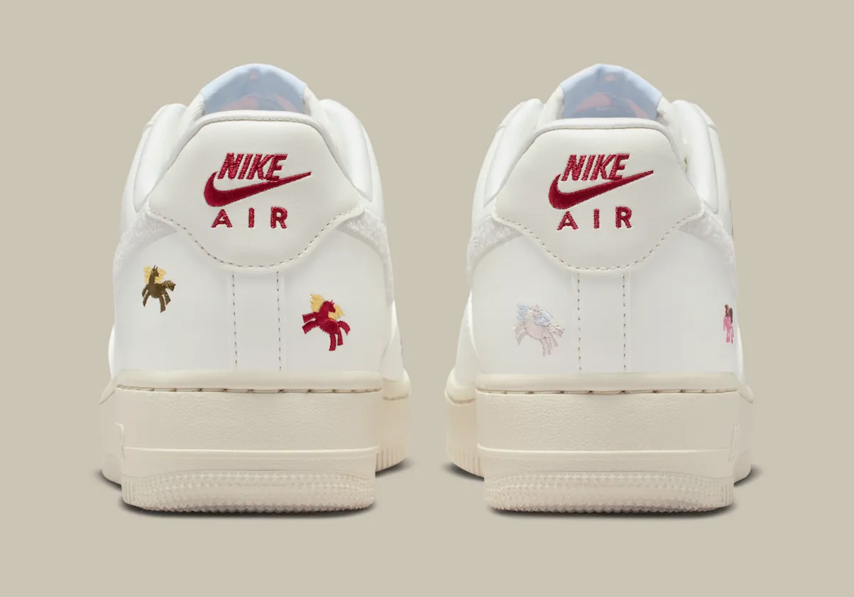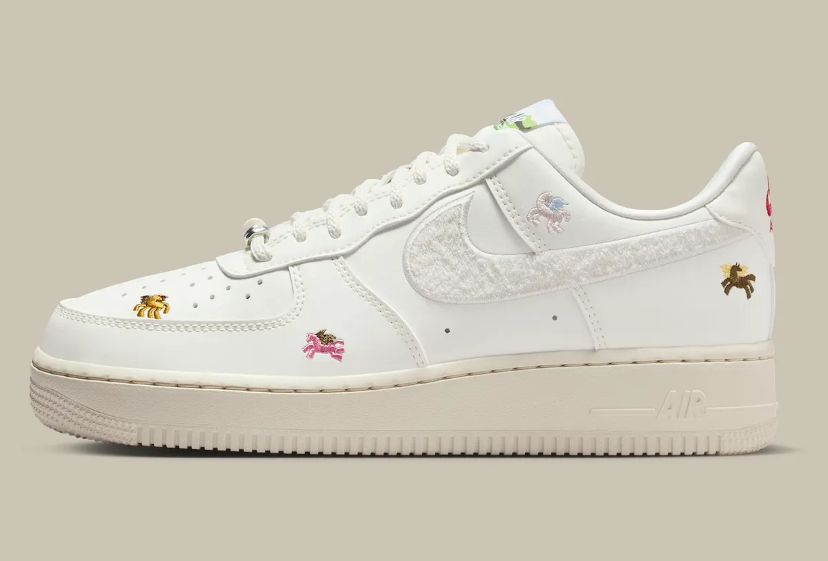 The shoe starts with a smooth Summit White upper, creating a clean backdrop for the pack’s story elements. Fuzzy chenille Swooshes add a cozy varsity touch, while multicolored Pegasus embroidery lands across the panels like tiny stitched collectibles, which falls in line with the “Year of the Horse” celebration. The lace charm keeps the theme going with a pastel bead paired to a small metal accent, echoing the pack’s whimsical vibe.