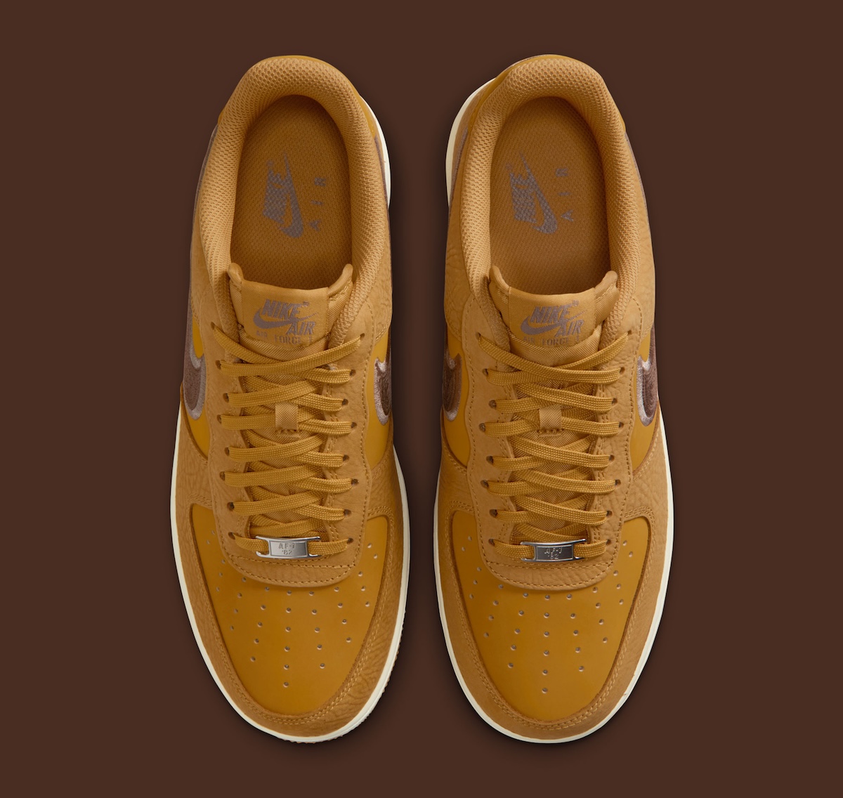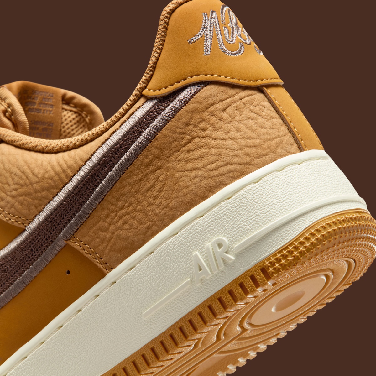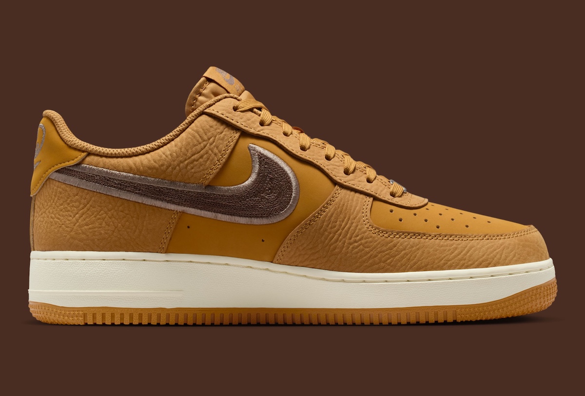 A tumbled Wheat leather upper shapes the base, delivering depth without overcomplicating the design. Matching overlays keep the look unified, while the Mink Brown embroidered Swoosh adds subtle texture. That stitched finish elevates the profile, giving this AF1 Wheat colorway a more premium edge than standard releases.
