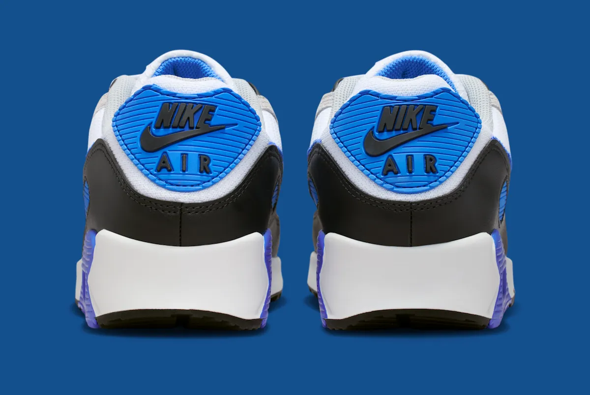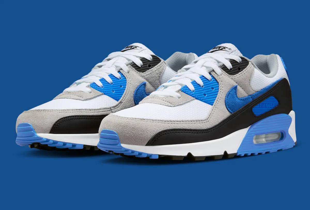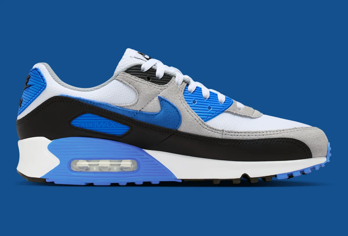 A white mesh base pairs with Light Smoke Grey suede overlays for a timeless foundation. Black mudguards and eyestays add contrast, while Blue Crystal details land on the Swoosh, eyelets, heel badge, midsole cassette, and outsole. While it shares some visual overlap with the 2024 “Hyper Royal” pair, this colorway still stays true to the Air Max 90s roots while offering a fresh update.