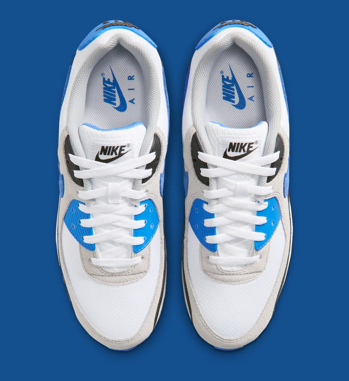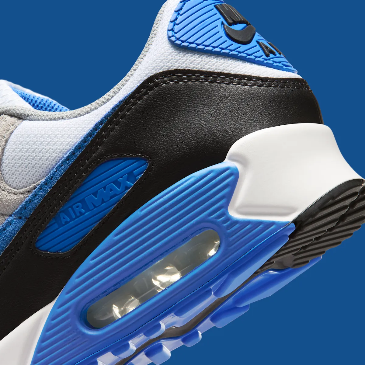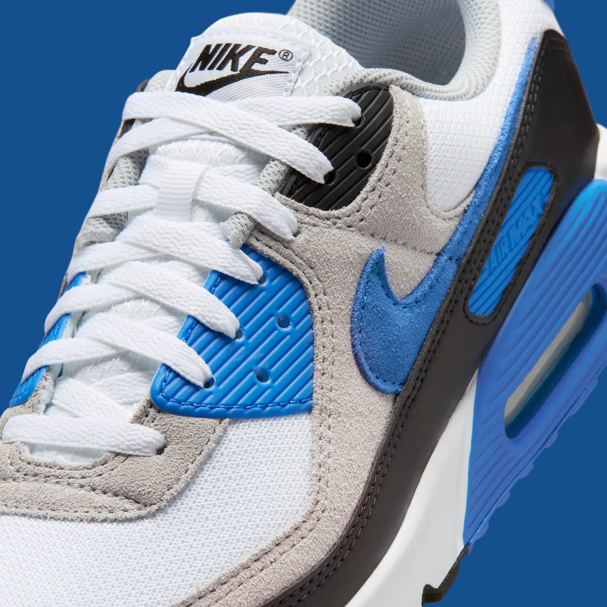 A white mesh base pairs with Light Smoke Grey suede overlays for a timeless foundation. Black mudguards and eyestays add contrast, while Blue Crystal details land on the Swoosh, eyelets, heel badge, midsole cassette, and outsole. While it shares some visual overlap with the 2024 “Hyper Royal” pair, this colorway still stays true to the Air Max 90s roots while offering a fresh update.