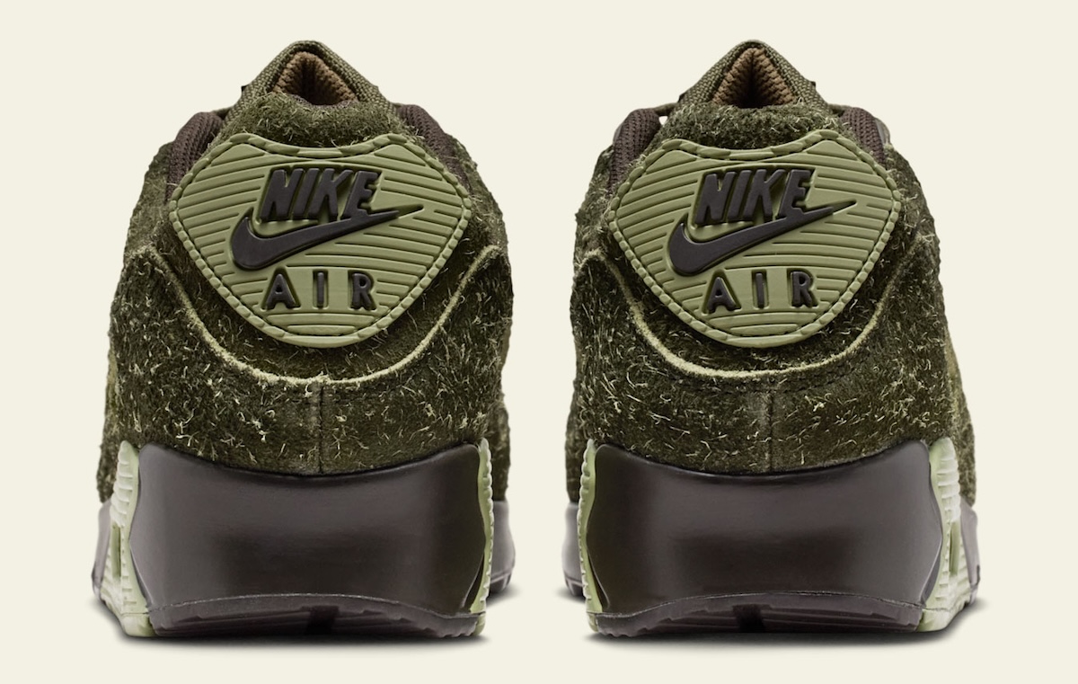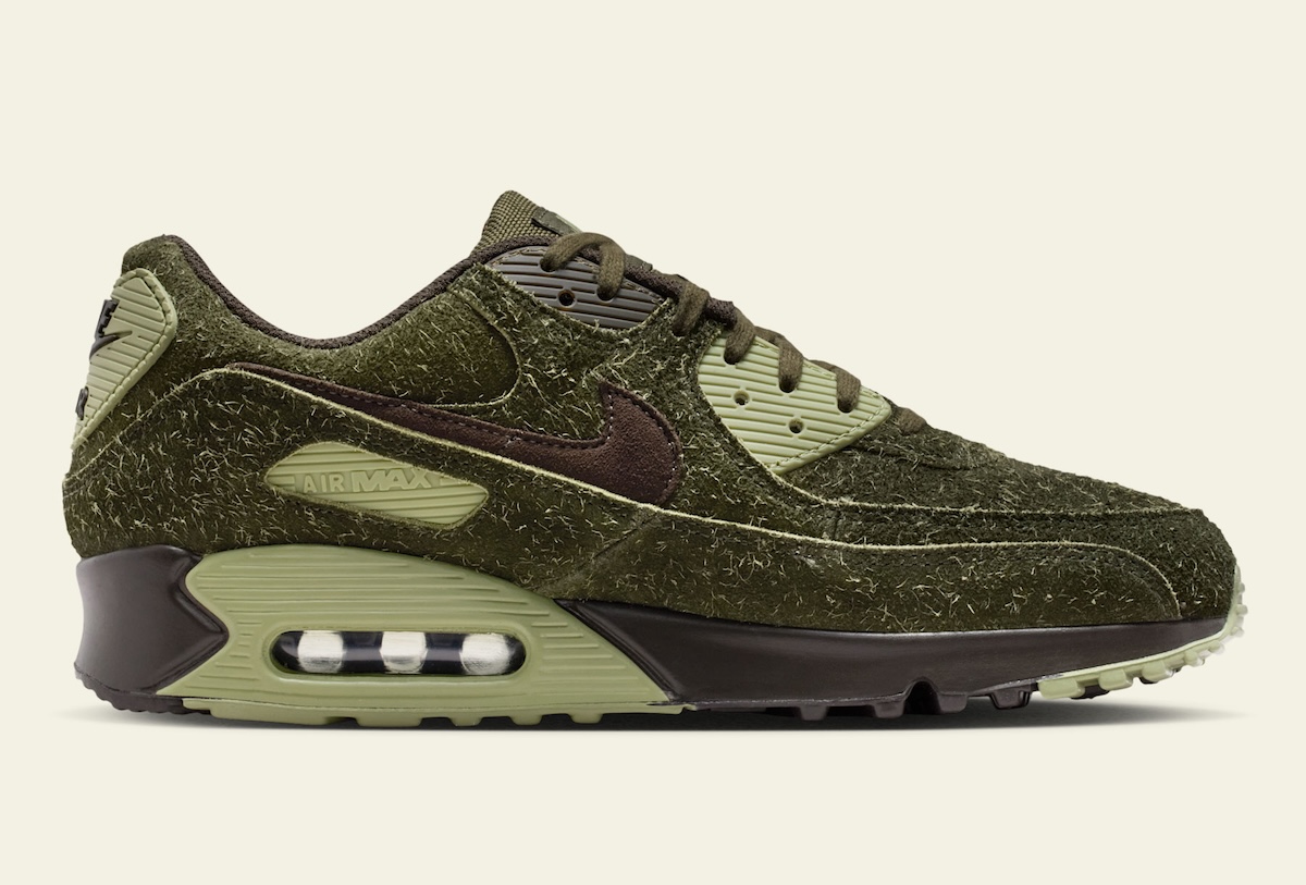 This Nike Air Max 90 brings back one of Nike’s most infamous themes to date. The new sneaker is based on the 2010 Dunk High Pro SB “Skunk.” The Fall 2025 colorway is a nostalgic, aggressive combination of Cargo Khaki, Old Moss, Dusty Olive, and Velvet Brown.