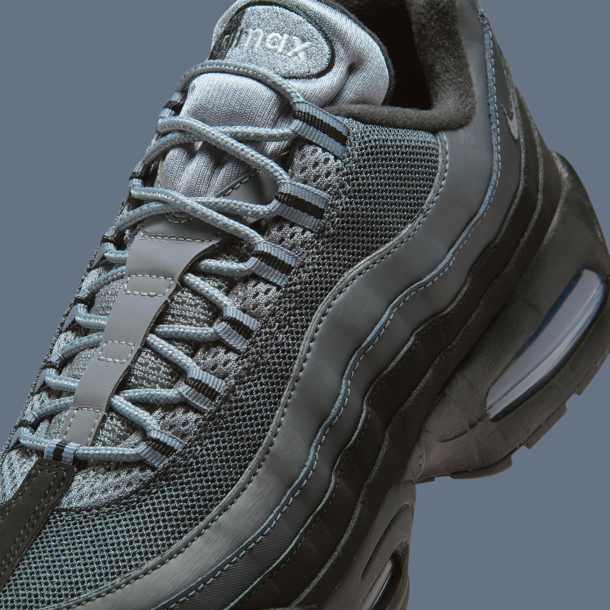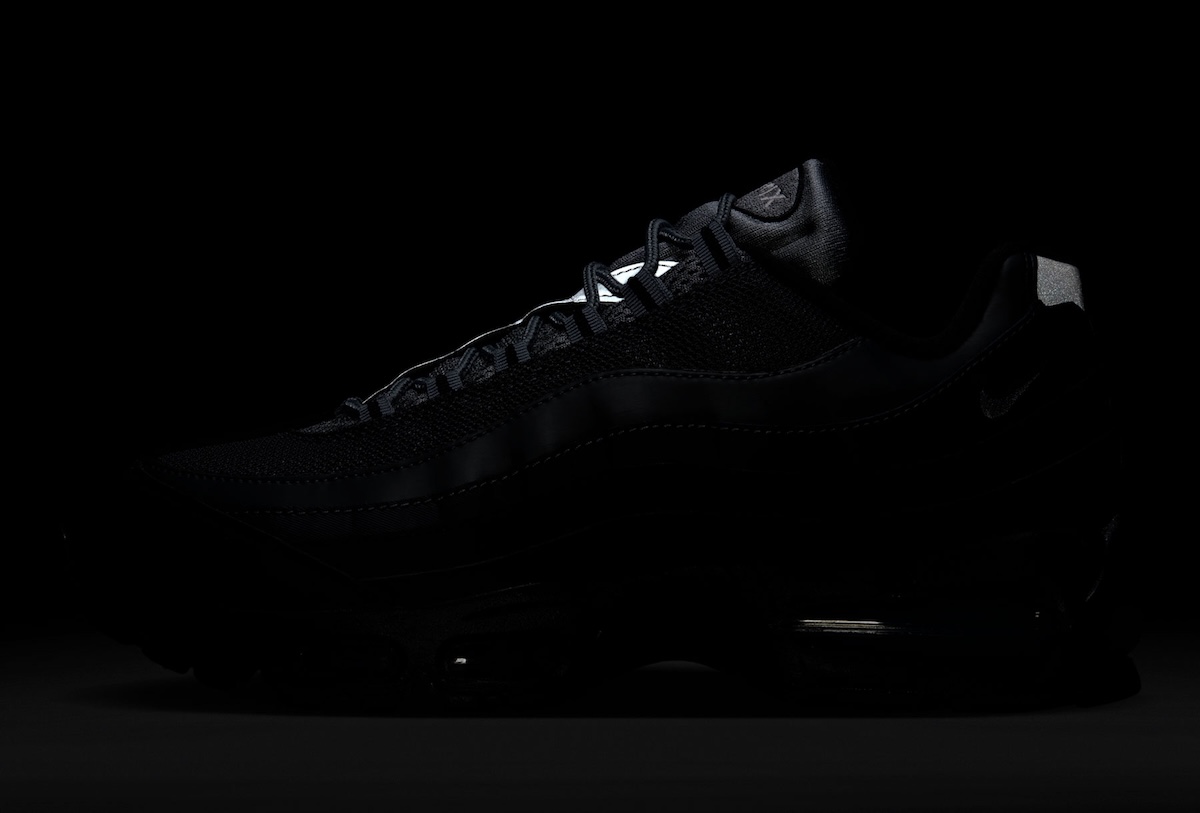 The upper features the Air Max 95’s signature gradient panels, built with black and anthracite mesh. Synthetic overlays sweep across the sides, while Metallic Silver branding adds controlled contrast. Reflective lace loops and rope-style laces underline the shoe’s technical roots without distracting from its clean flow.