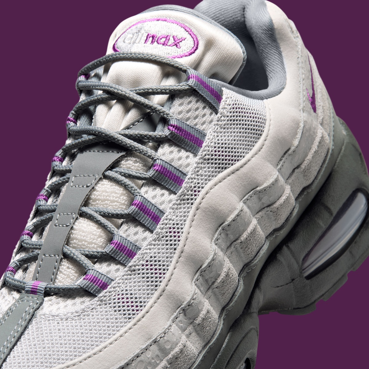 Down toward the base, a Cool Grey leather mudguard wraps around the toe and lower edges. The lace setup follows the Air Max 95 formula as well, using webbed eyelets that pull the upper together. Bold Berry stripes woven into those lace loops provide the first real contrast against the otherwise muted color scheme.