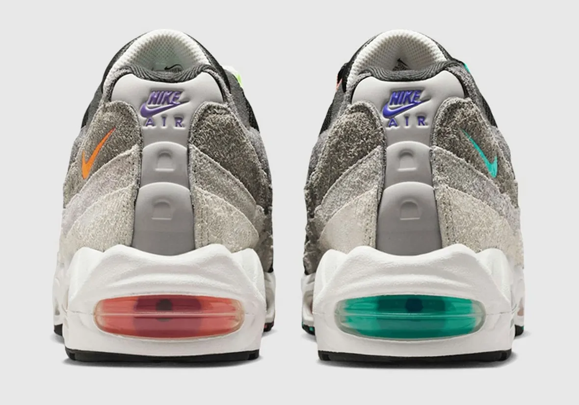 Details help separate this release from earlier versions. Colored Air units, mismatched branding, and contrasting eyelets highlight the split design, while the enlarged Big Bubble unit continues to push the updated build forward. The result feels both nostalgic and modern, tying together decades of Air Max 95 history.