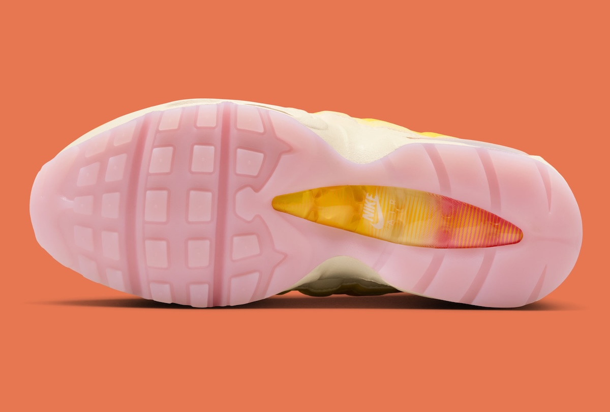 Glossy leather wraps the toe, spine, and upper overlays, adding depth with a subtle carbon-style finish. However, the gradient netting becomes the focal point. Its sherbet-like blend introduces motion and contrast, offering a visual break from the solid panels seen on earlier Air Max 95 releases.