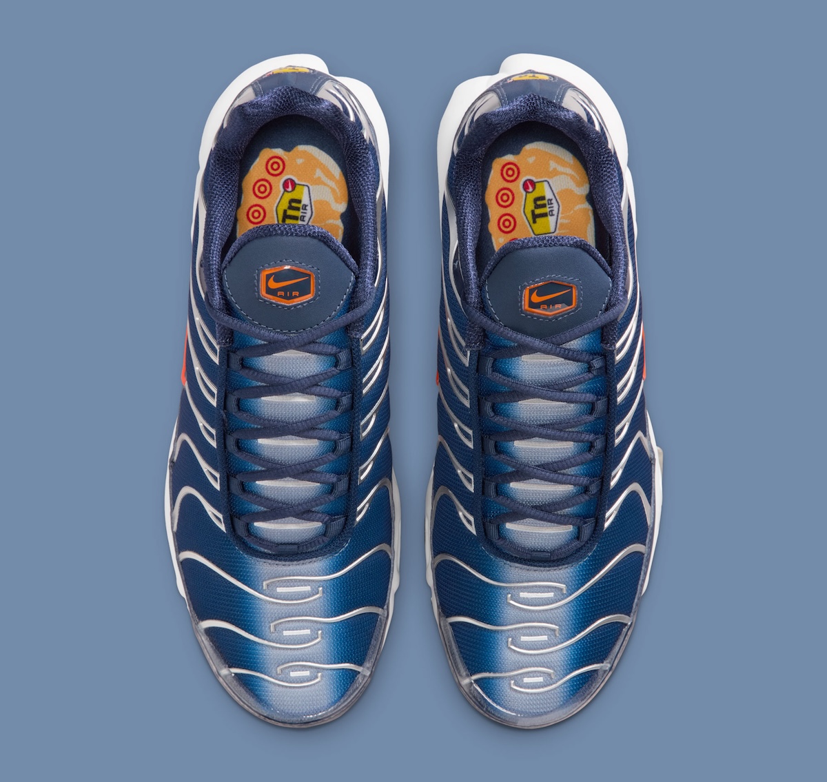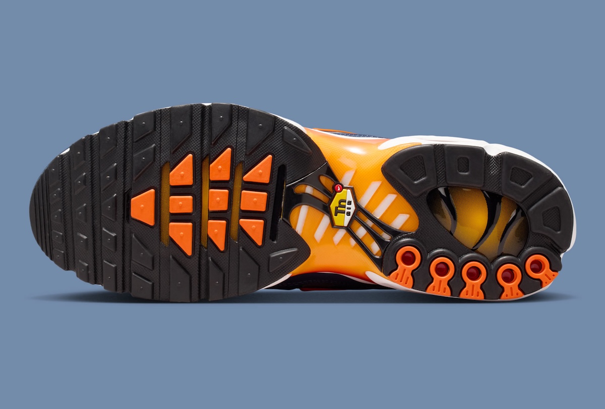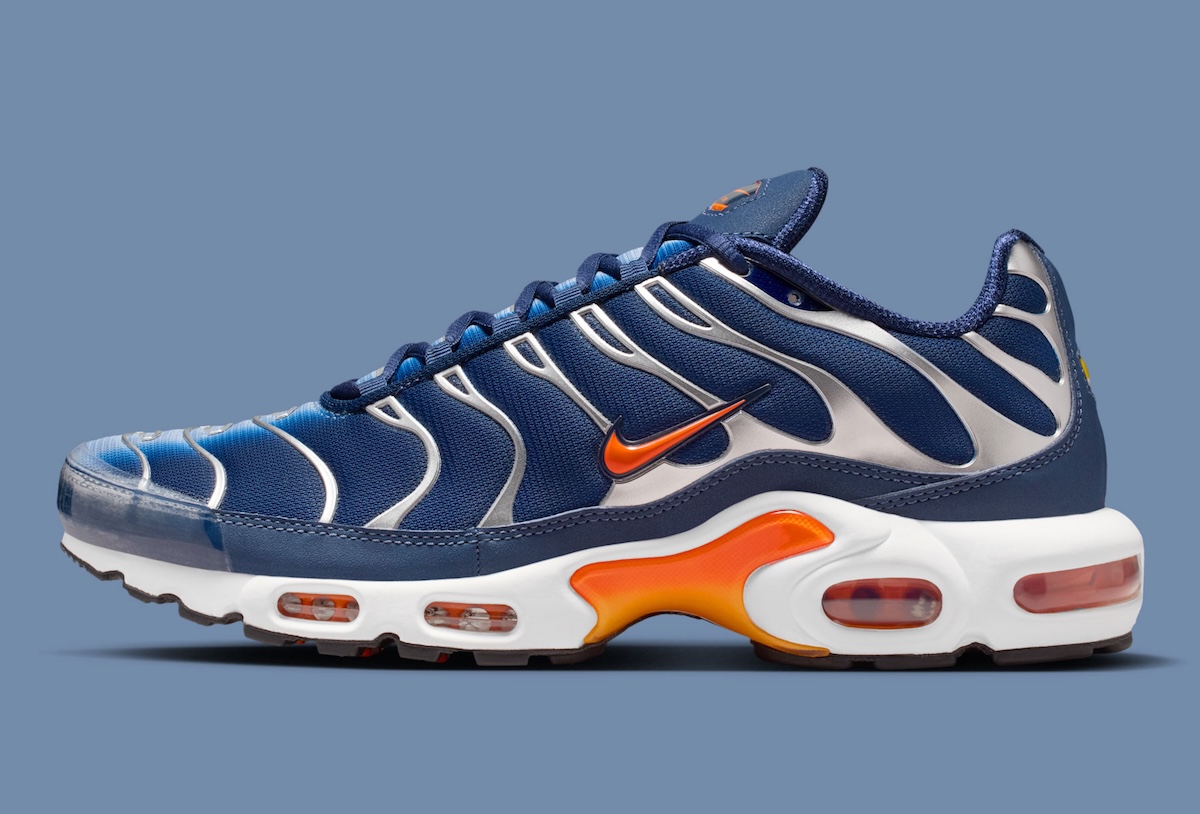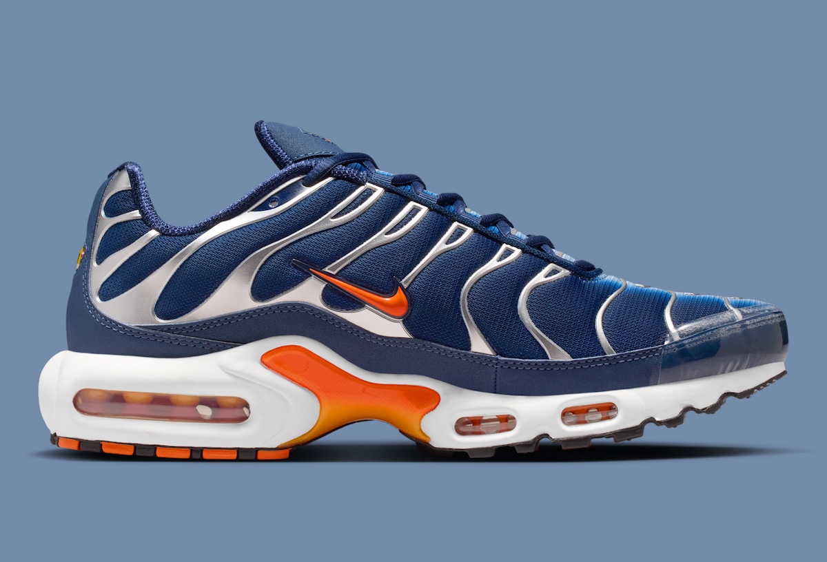 The upper is wrapped in deep navy shades, keeping the profile clean and controlled. Safety Orange details cut through the palette at the branding, midfoot shank, and visible Air Max cushioning. That contrast recalls earlier Nike Air Max Plus colorways built for visual impact, especially during the silhouette’s peak streetwear run.