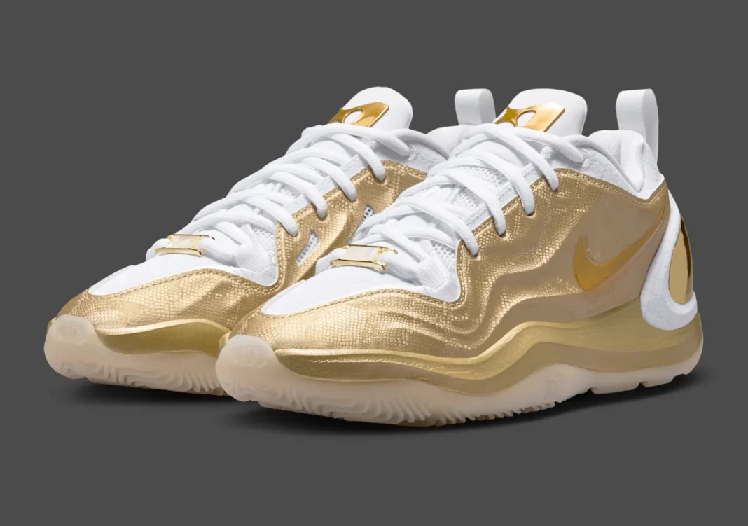 White sets the base across the upper, with quilted detailing placed on the toe box, eyestay, tongue, luffles, and collar. Metallic gold overlays wrap the side panels and carry a subtle snakeskin texture, while a darker gold shade is used on the Swoosh and signature branding. The heel is finished with a glossy gold TPU piece marked with A’ja branding, and the outsole comes in a semi-translucent finish with gold details underneath.