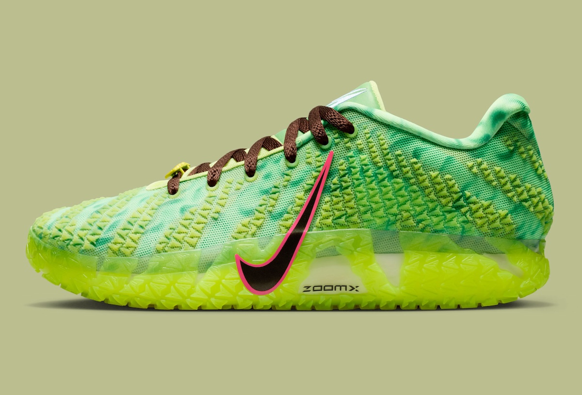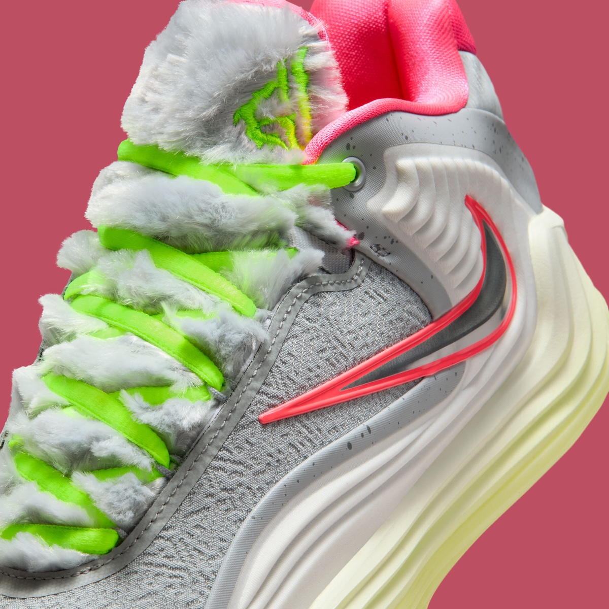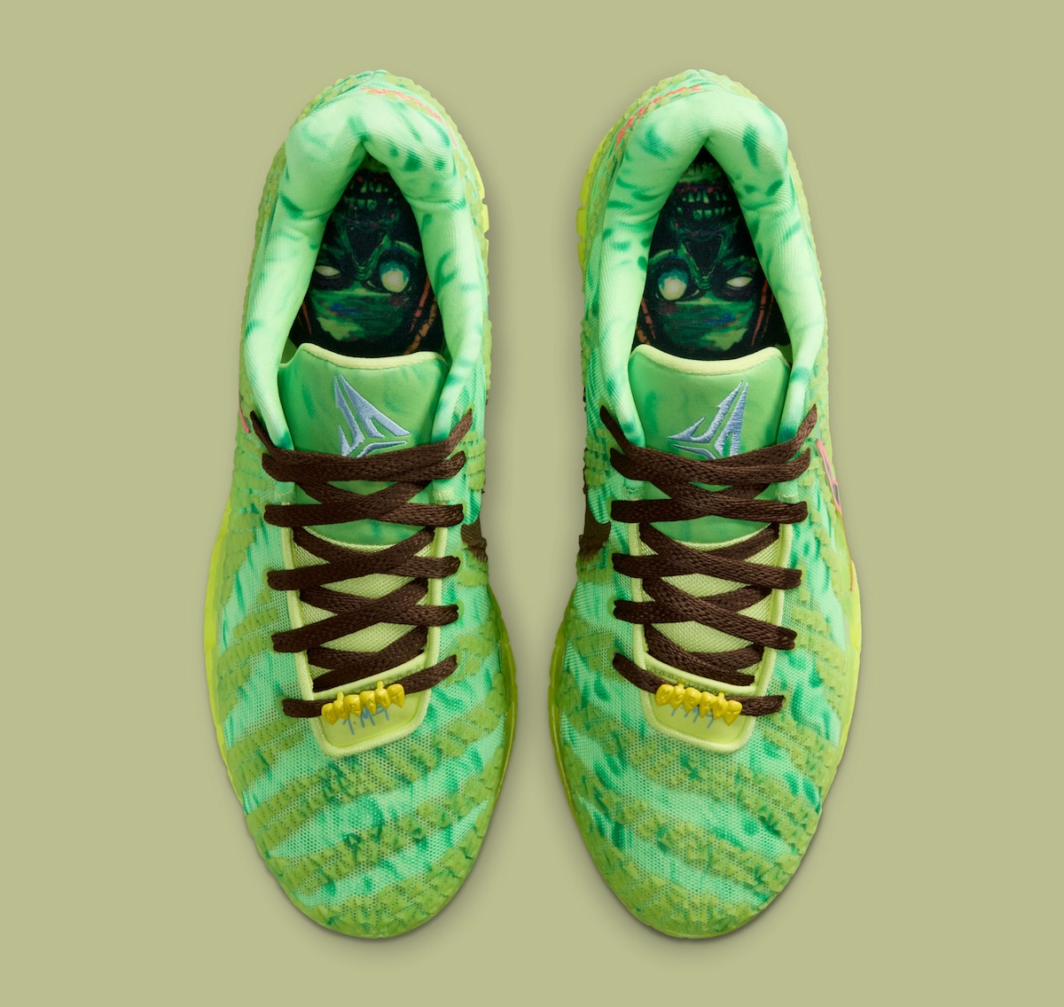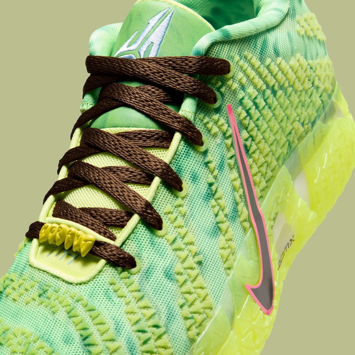 Halloween takes on a pumpkiny orange tone on Victor Wembanyama’s G.T. Hustle 3, decked out in flame-like foil overlays. Ja Morant’s Ja 3 trades in the dripping blood of a zombie apocalypse for a radioactive glow up, with a neon green upper and glow-in-the-dark accents. Devin Booker’s Book 1 takes a more “incognito” approach, embracing a sleek “Scorpion” (Scorpio) theme with black patent overlays layered in holographic detailing. Kevin Durant’s KD 18 “Slim Reaper” checks off Durant’s moniker with bone-themed graphics creeping up the upper, while Giannis’ Freak 7 “Shapeshift” jumps on the monster bandwagon with knobby fur textures and neon accents.