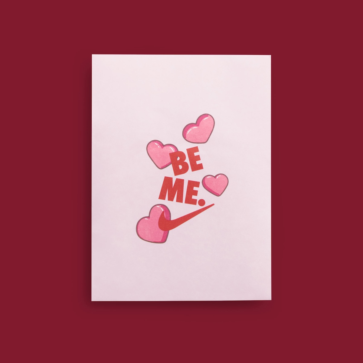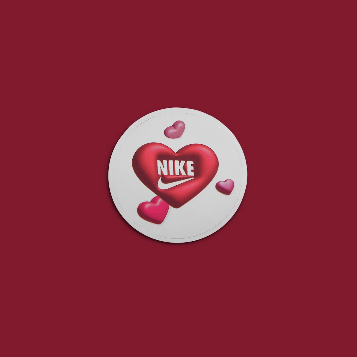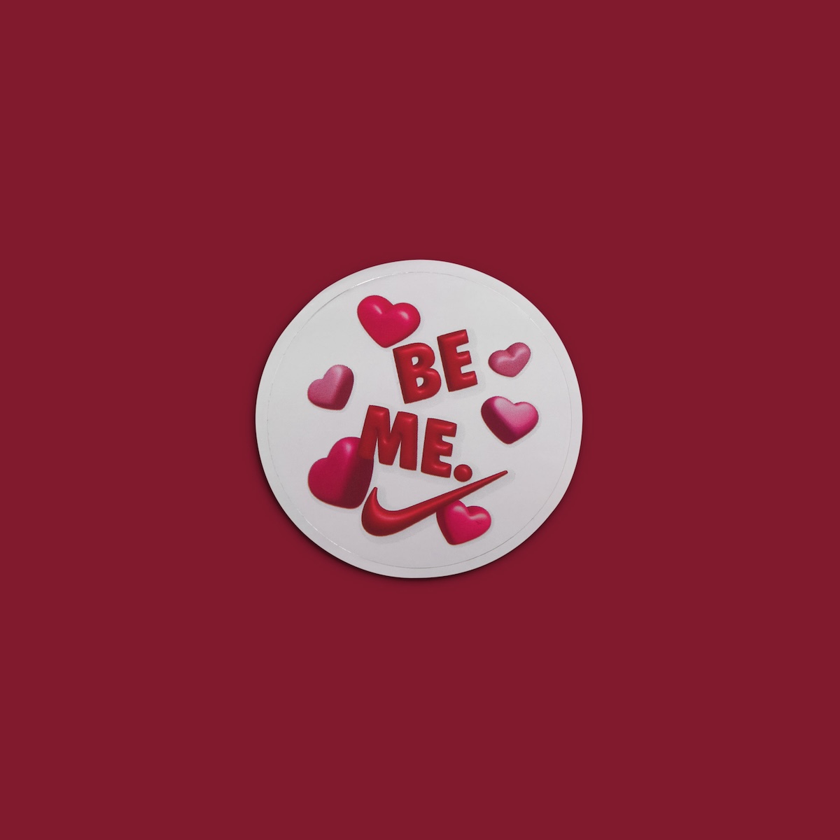Red patent hits the toe and mid panels first, then pink overlays wrap around them to soften the look. The matching pink sole keeps the look cohesive. A “Be Me” message appears on the inner tongue, framed by heart graphics that highlight the self-love theme. The outer tongue adds a red heart with Nike branding, and themed stickers continue the Valentine narrative.