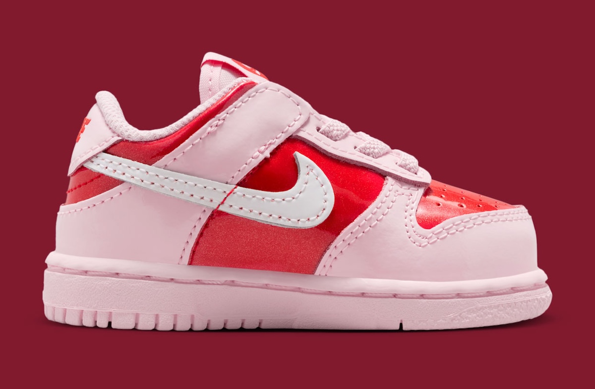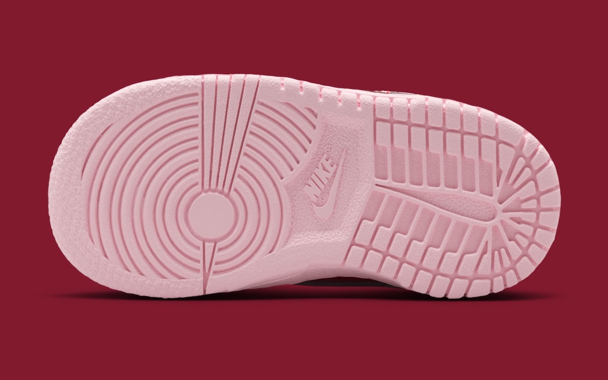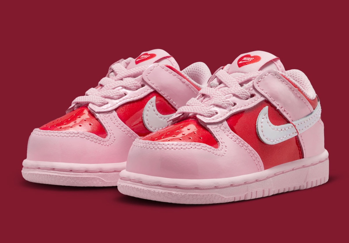 This toddler colorway uses Pink Foam, Light Crimson, and Summit White. The mix creates a cheerful palette that fits the February season. Fans of festive Dunk releases will likely enjoy the small touches shaping this design.