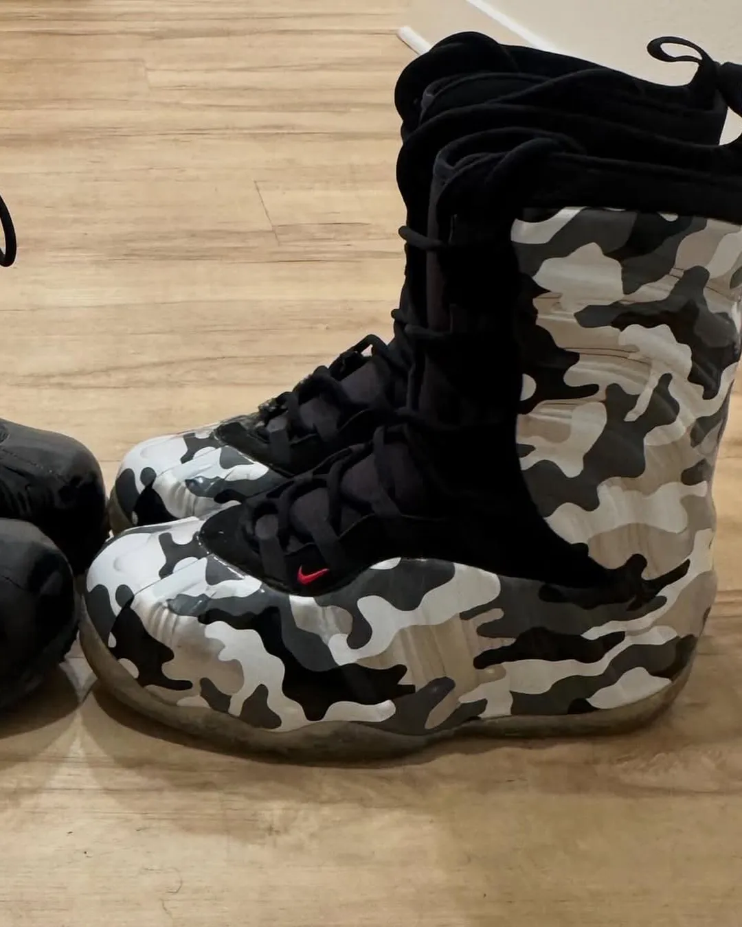 It was first spotted in the 2010s and looks almost identical to the Nike Kaiju Snowboarding Boot, a boot developed under Scott Keating when he was the head of Nike Snowboarding. The sample pack has a molded Foamposite shell, it is a tall shoe to wrap the ankle and it has biting traction suitable for use on snow. Photos in-hand have shown pairs were made in a standout camo colorway, an all-black colorway, and even a gold camo color makeup – one even being listed for sale by an employee for $2,650. Written on the insole in clear is “SAMPLE – Property of Nike, Not For Resale.”