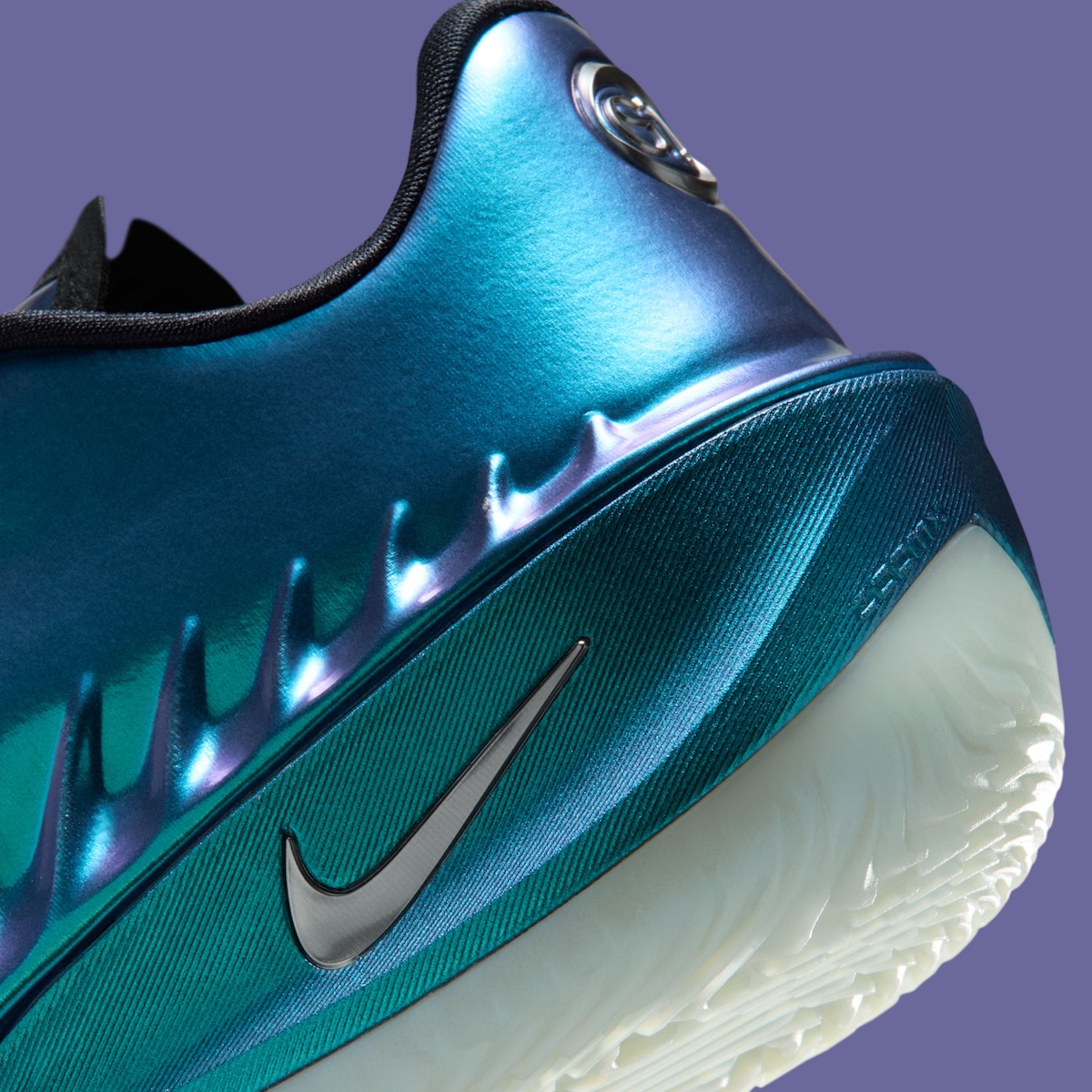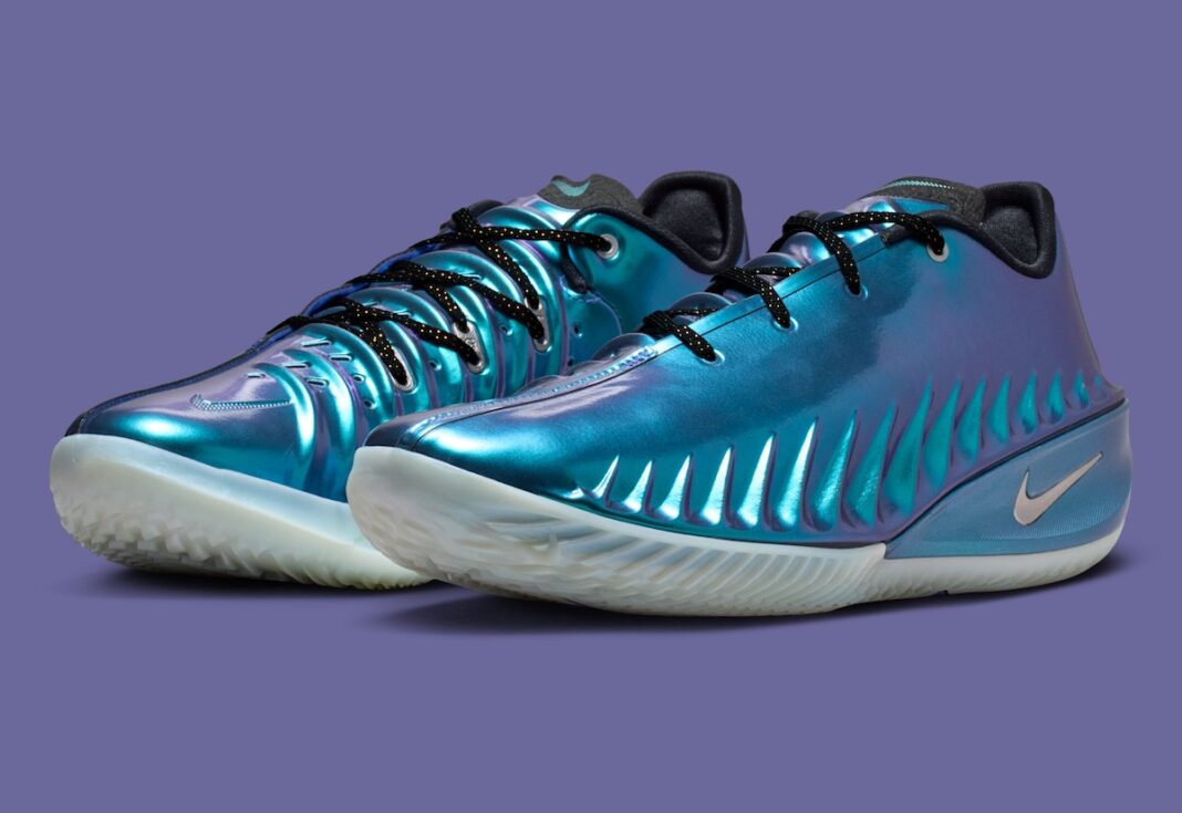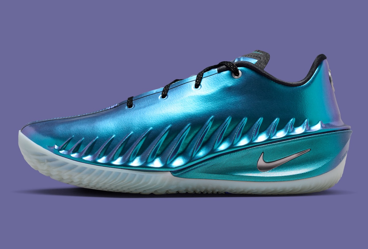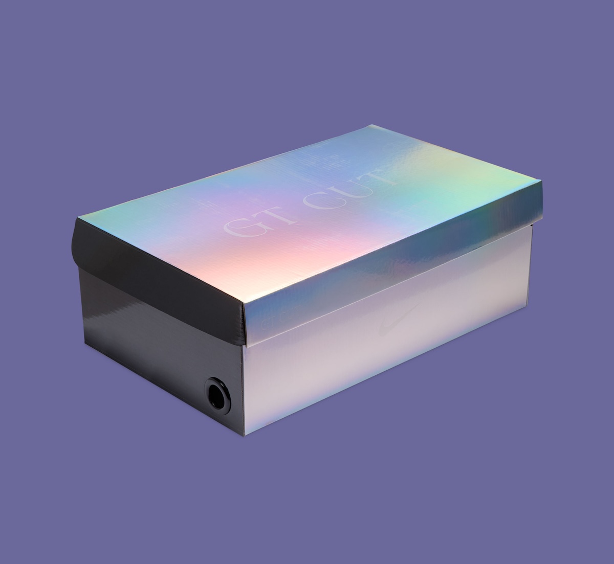Elements like the Nike GT Cut’s metallic upper transition between Glacier Blue and chrome while providing a sleek, liquid-like finish. Functional, sculpted details like side “gills” increase ventilation and enhance stability without adding extra material. Throughout, a rigid exoskeleton upper, streamlined lace system, and chilly outsole palette opt for sleekness over excess. Even the iridescent packaging and holographic Nike dust bag complement the shoe’s stylish complexity.
