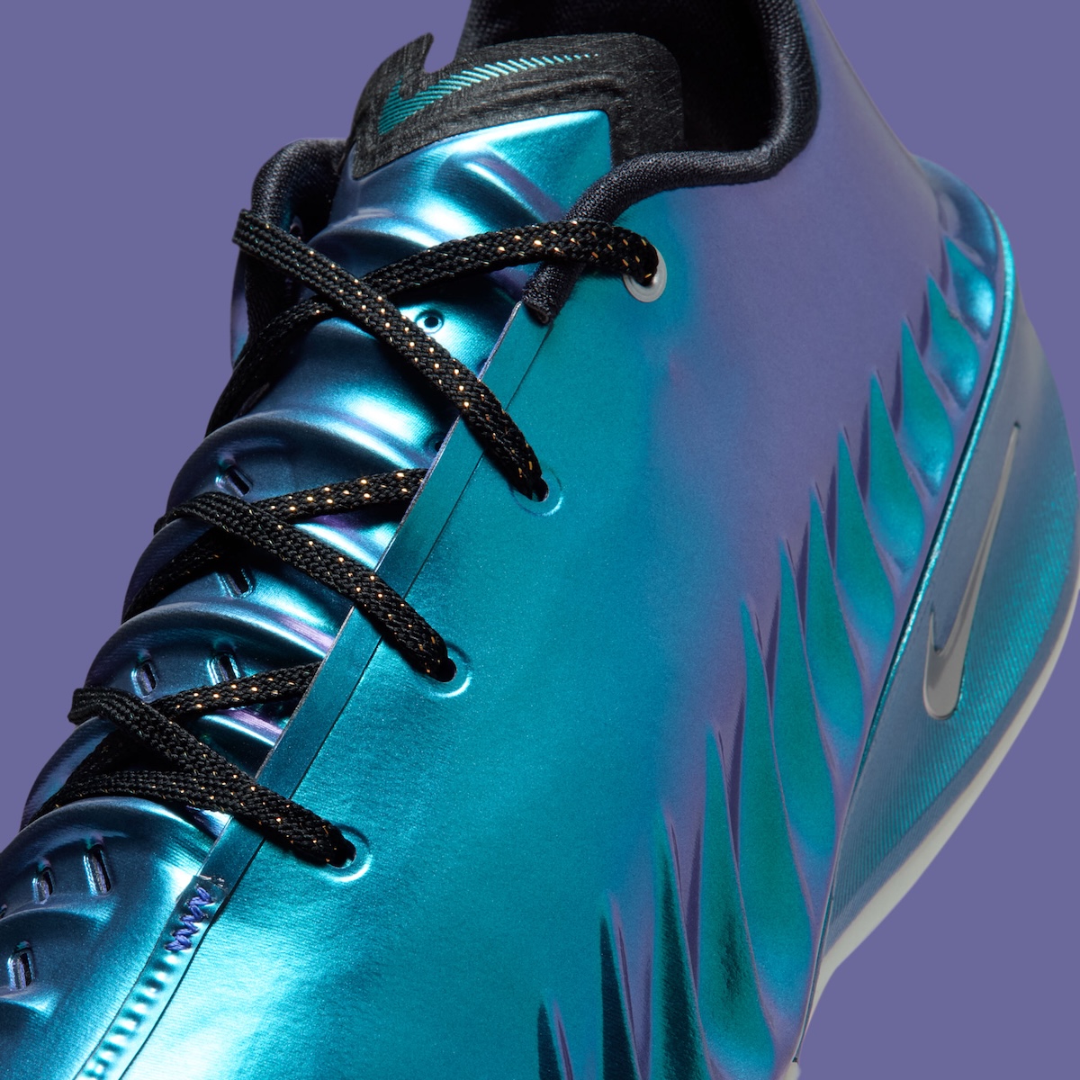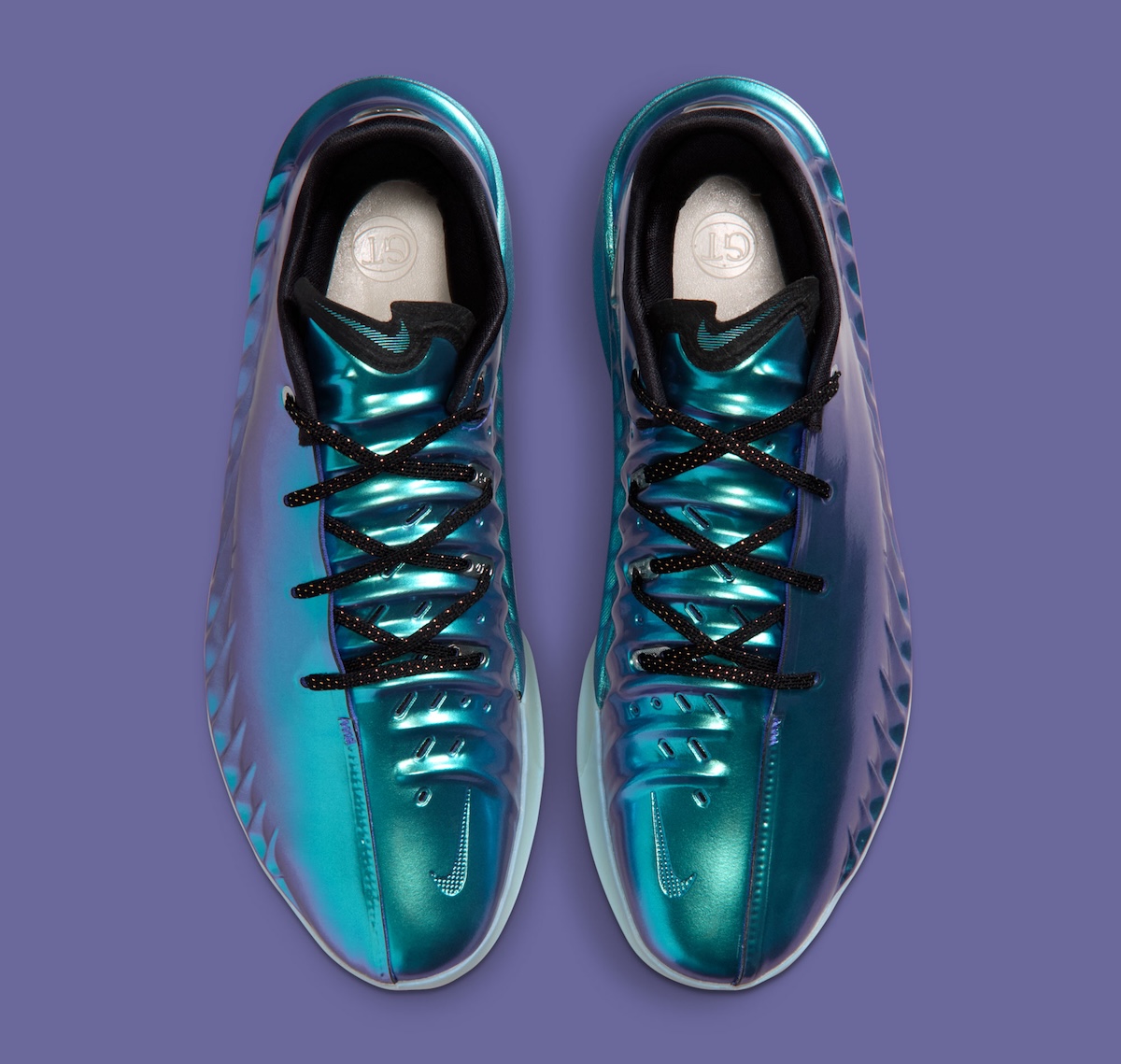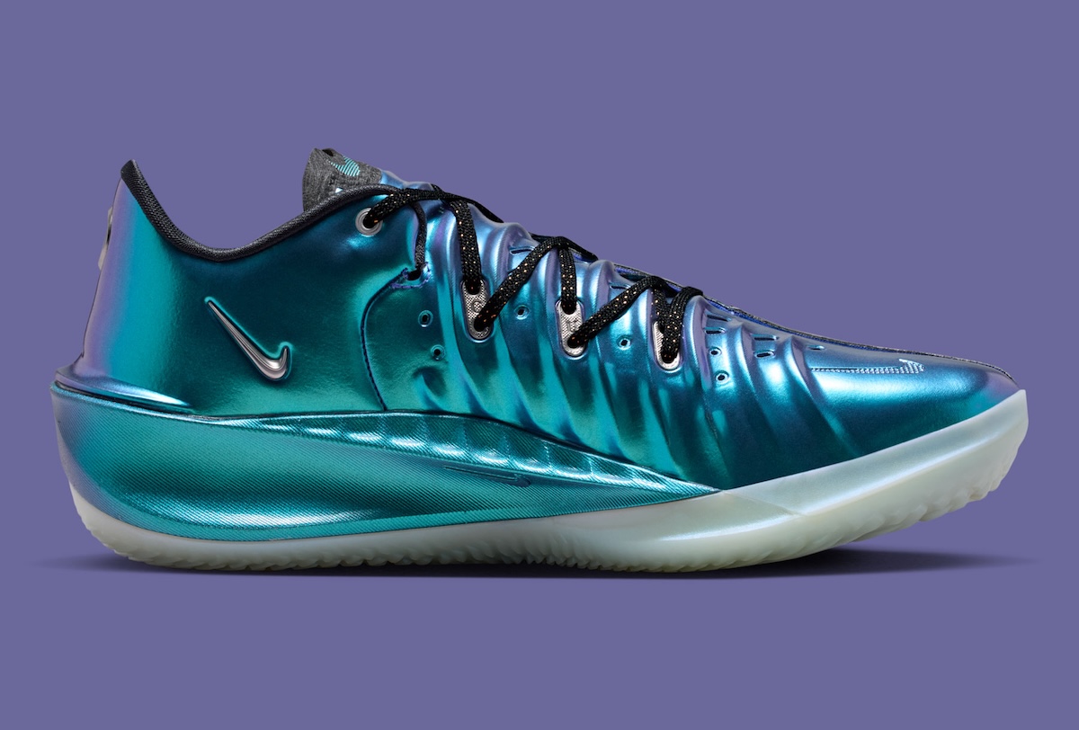 Elements like the Nike GT Cut’s metallic upper transition between Glacier Blue and chrome while providing a sleek, liquid-like finish. Functional, sculpted details like side “gills” increase ventilation and enhance stability without adding extra material. Throughout, a rigid exoskeleton upper, streamlined lace system, and chilly outsole palette opt for sleekness over excess. Even the iridescent packaging and holographic Nike dust bag complement the shoe’s stylish complexity.