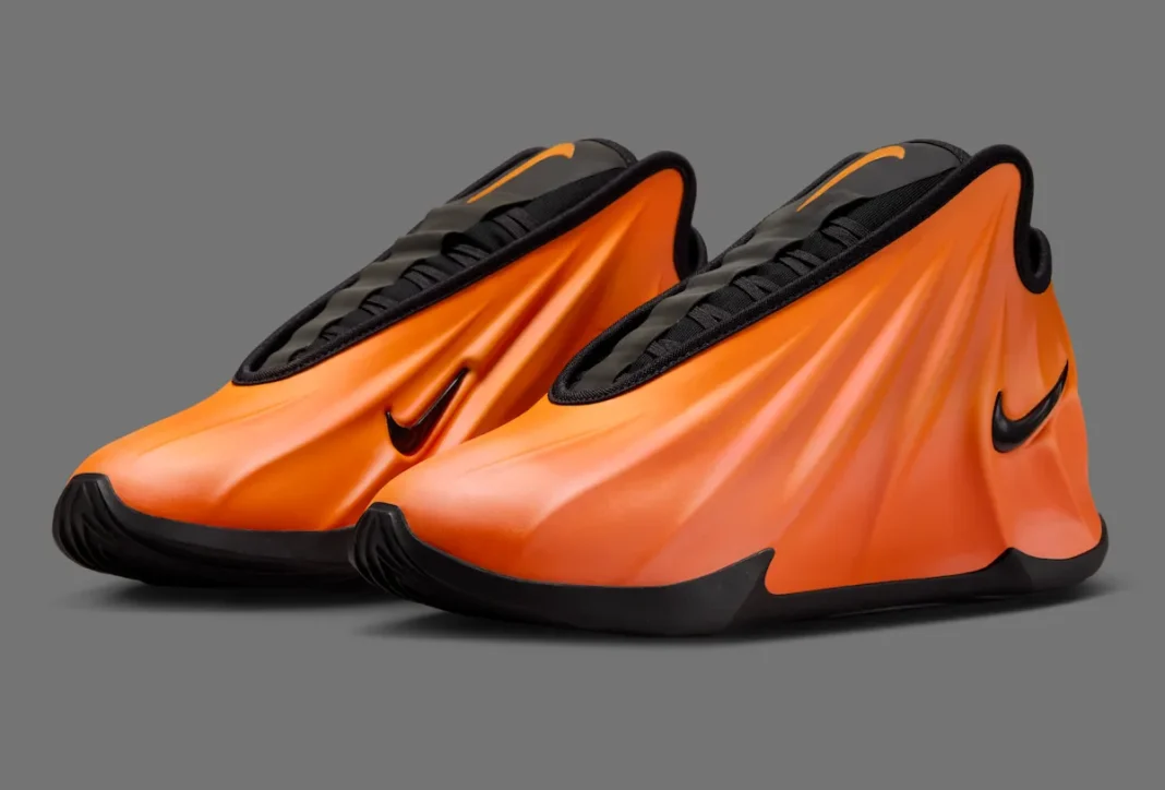 The GT Future Fire features a striking Bright Ceramic molded upper with sculpted grooves that create a molten, flowing look. The sneaker’s seamless shell design resembles past icons like the Foamposite and Flightposite. Black accents on the liner, midsole, and Swoosh provide a sharp contrast to the bright orange hue.