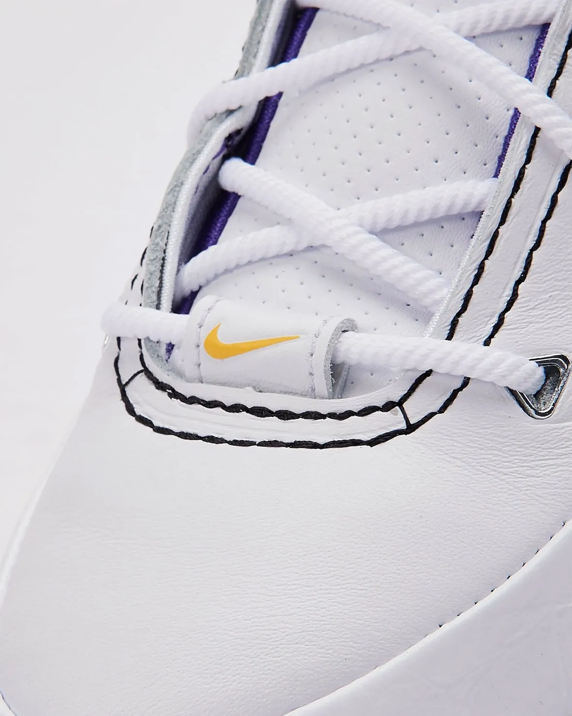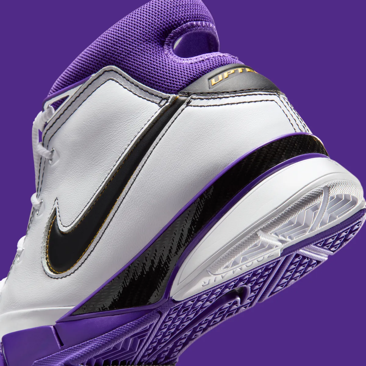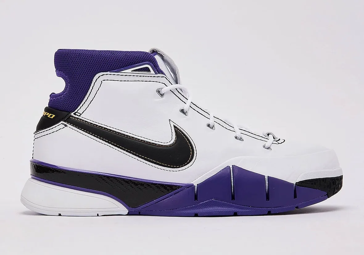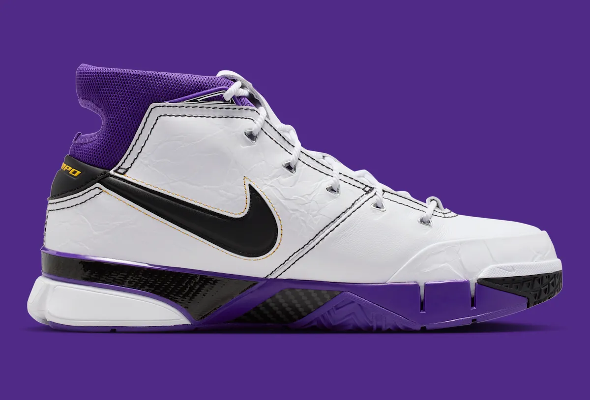 This version features the signature Lakers mix of White, Black, and Court Purple. The upper uses premium leather, while Zoom Air cushioning and a carbon fiber shank deliver game-ready performance. Inside the shoe, the insole pays homage to four cities—Los Angeles, Houston, Atlanta, and Denver—each tied to Kobe’s scoring sprees.