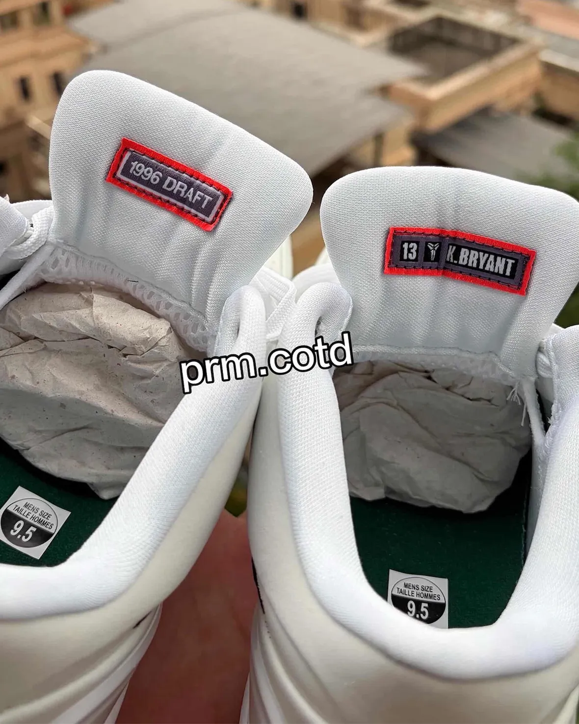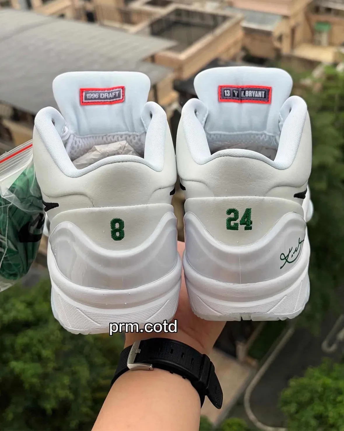 The shoe keeps things clean with a white upper, black Swoosh, and green accents that bring the Celtics connection into focus. Details on the tongues reference both “1996 Draft” and “13 K. Bryant,” while the heels split Kobe’s familiar 8 and 24 numbering. The insoles appear to stamp the pair with a large “6,” a nod to Walker’s draft position and the detail that separates this version from the similarly styled “Milwaukee Bucks” pair.