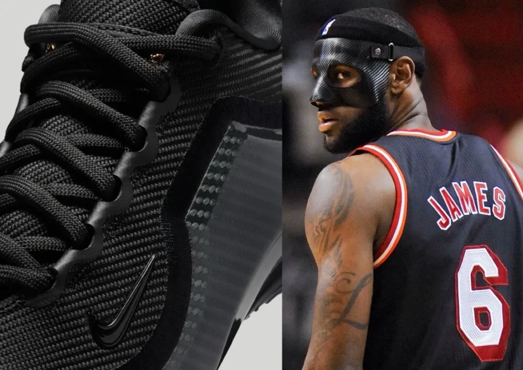 Built almost entirely in black, the pair reads less like a standard colorway and more like a material study. The engineered mesh upper is layered with glossy, carbon-fiber–style panels that subtly echo the protective mask James wore, while the all-black rubber outsole and sculpted heel geometry keep the silhouette aggressive without looking busy. Small metallic hits on the lace hardware provide contrast, but restraint is clearly the theme—an evolution of how LeBron’s storytelling shoes have shifted from loud references toward cleaner, concept-driven design.