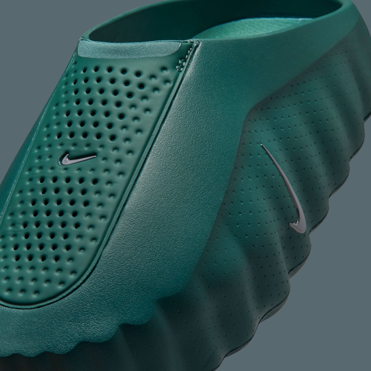 Unlike past statements, this version favors balance and restraint. The muted green upper feels considered, echoing wellness culture and recovery-focused design. It positions the shoe as both recovery footwear and a lifestyle slip-on.