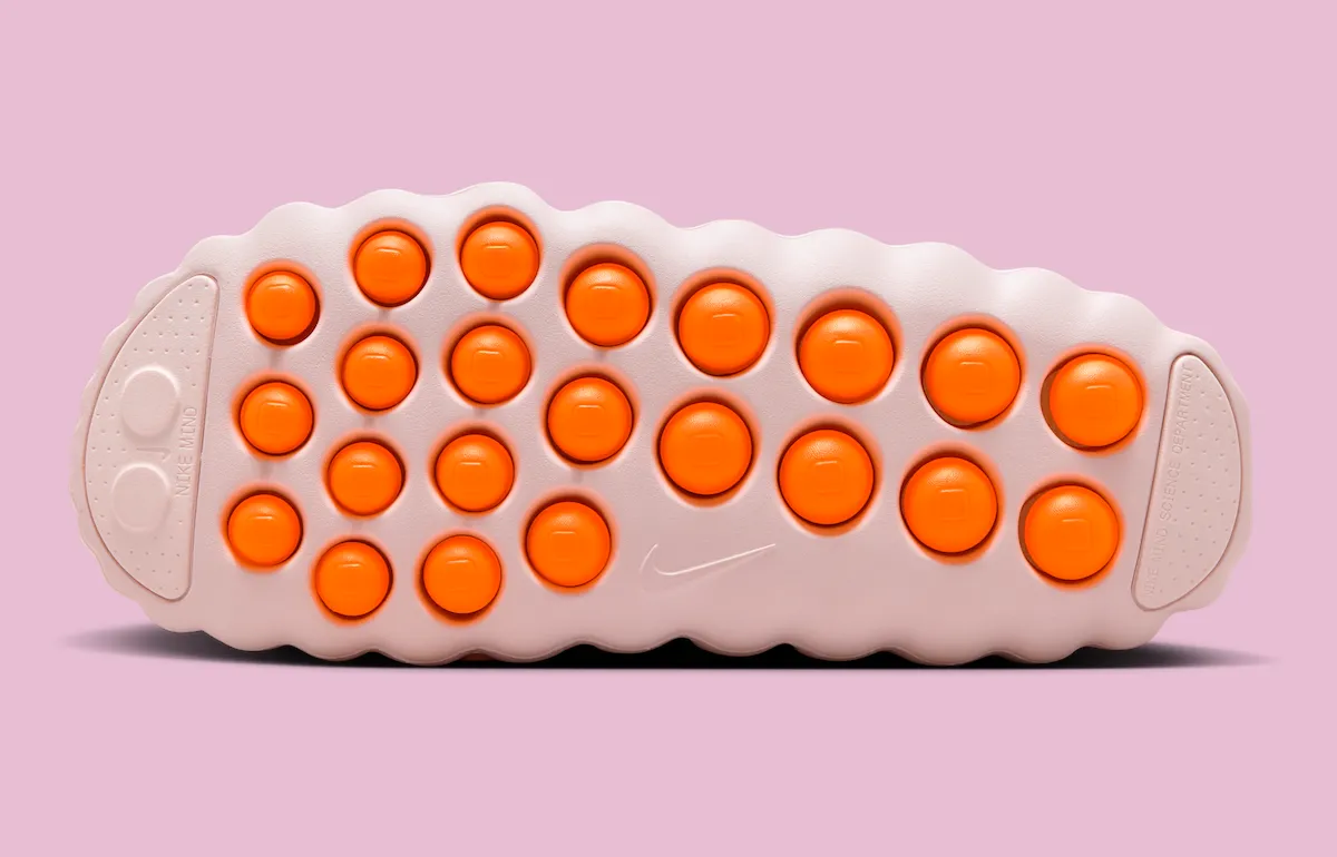 Underneath, the Mind 001’s standout feature remains its podded outsole system. Bright orange nodes sit across the bottom of the shoe in a grid layout, designed to create gentle stimulation underfoot while walking. According to Nike, this design helps trigger sensory responses through the foot, reinforcing the neuroscience-inspired philosophy behind the Mind series.