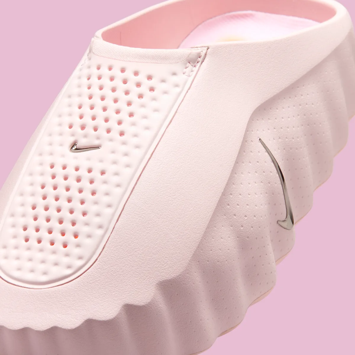 The “Pearl Pink” edition delivers a clean pastel aesthetic across the molded slip-on upper. The entire silhouette appears in soft pink tones, while a small metallic Swoosh at the midfoot adds a subtle contrast. Perforations across the vamp reveal glowing interior details beneath the surface, giving the minimalist design a futuristic edge.