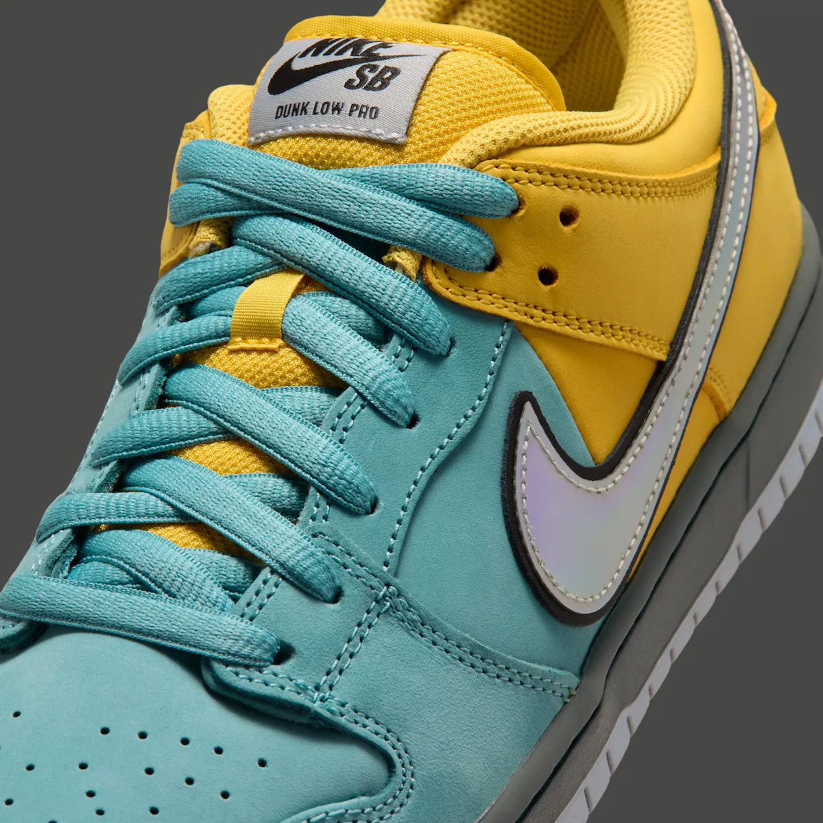 Turquoise nubuck covers the toe box, eyestays, and quarter panels, while yellow takes over the collar, heel, and tongue for a split-color look that mirrors the changing shades once seen on old Muni Fast Pass cards. Chrome Swooshes run across the sides with an iridescent finish, while a grey midsole and icy outsole help ground the brighter upper.