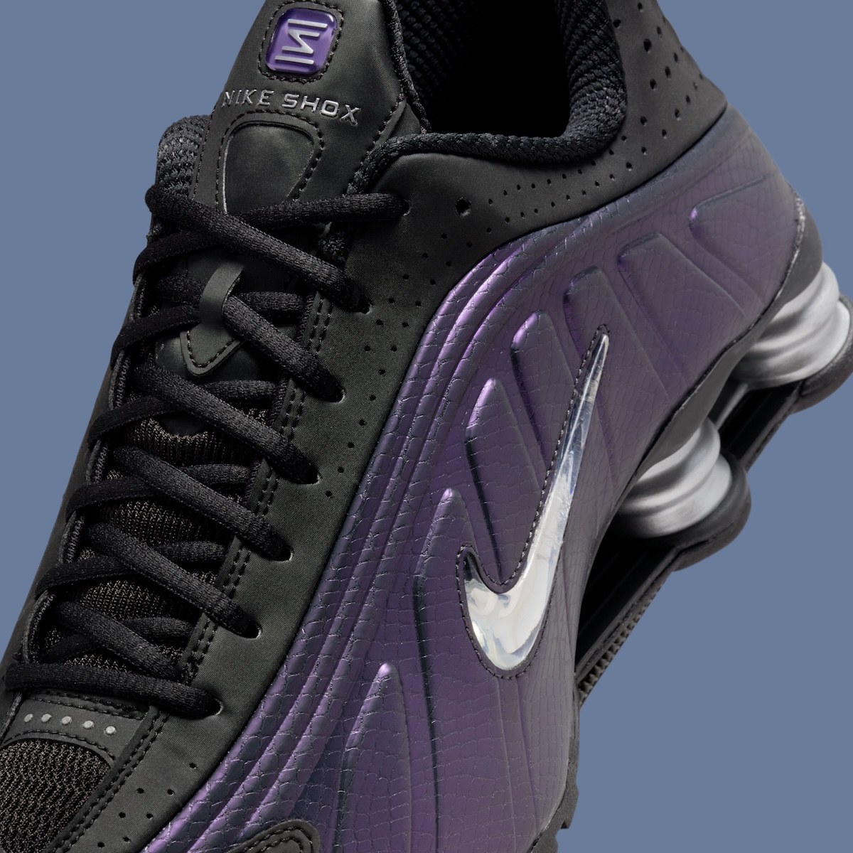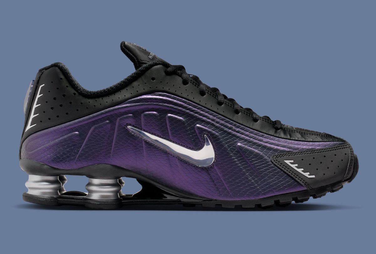 The Nike Shox R4 “Purple Dynasty” immediately grabs attention with an upper that blends faux-reptile texture and a shifting purple gradient.