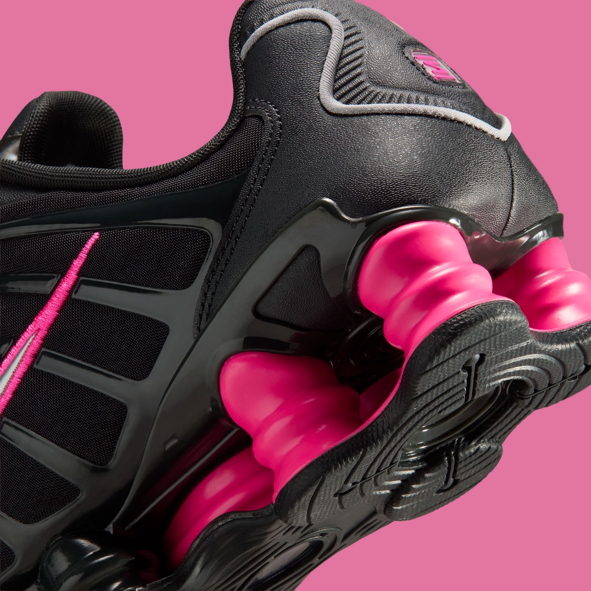 The Shox columns carry most of the weight visually. That bright pink cushioning makes the heel impossible to ignore. It gives the shoe a sculpted look that feels mechanical and bold. The Swoosh follows suit, pairing metallic silver with a pink outline for extra depth. Up top, the molded cage keeps the Shox identity intact.