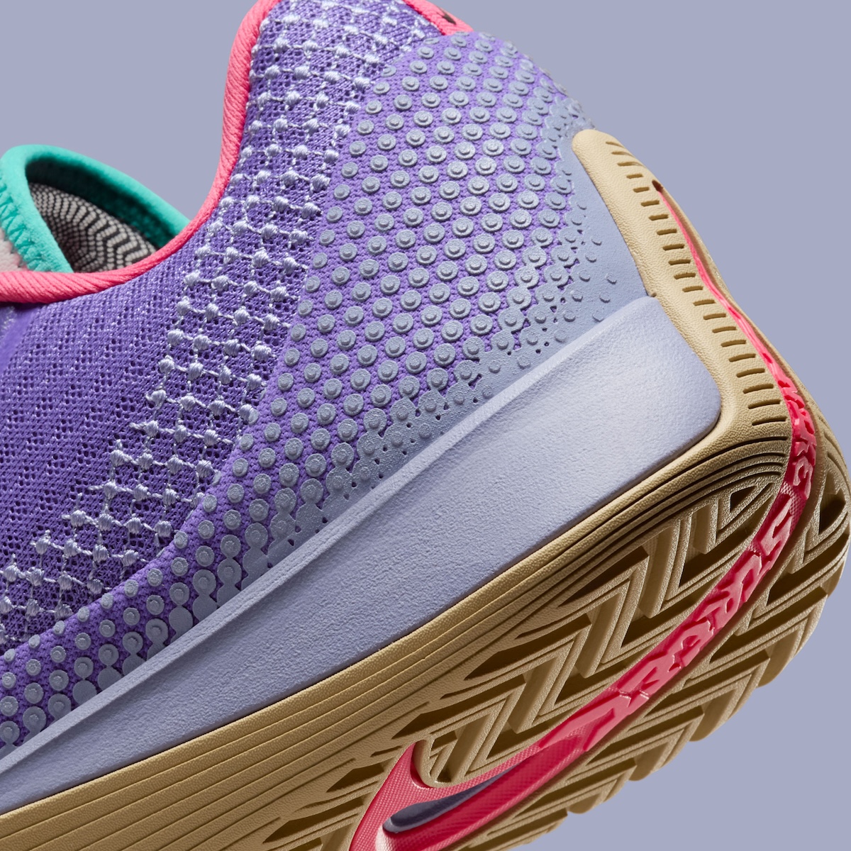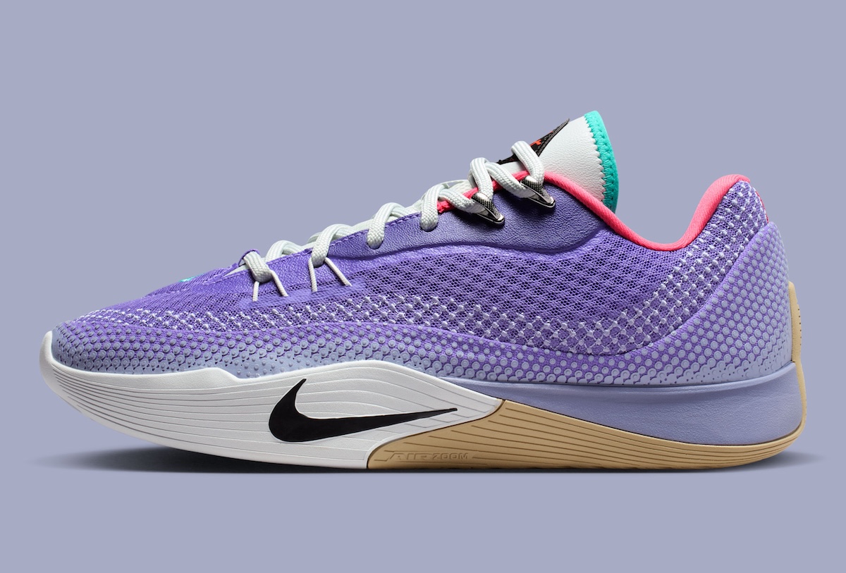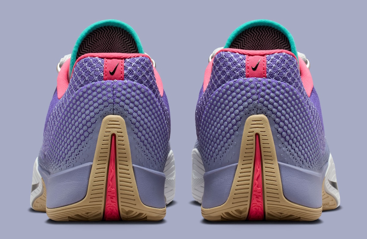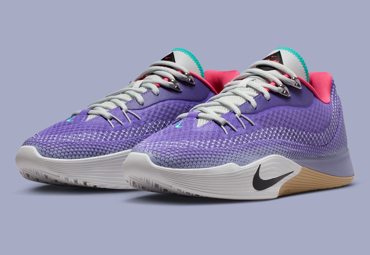 Bright hot pink accents on the lining and aqua blue tongue detail contrast with the shoe’s overall purple tone, while the gum outsole helps tie it all together. The sneaker’s Zoom Air cushioning provides ample support and responsiveness.