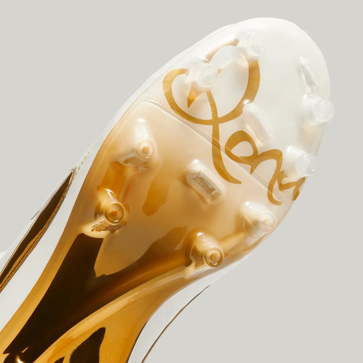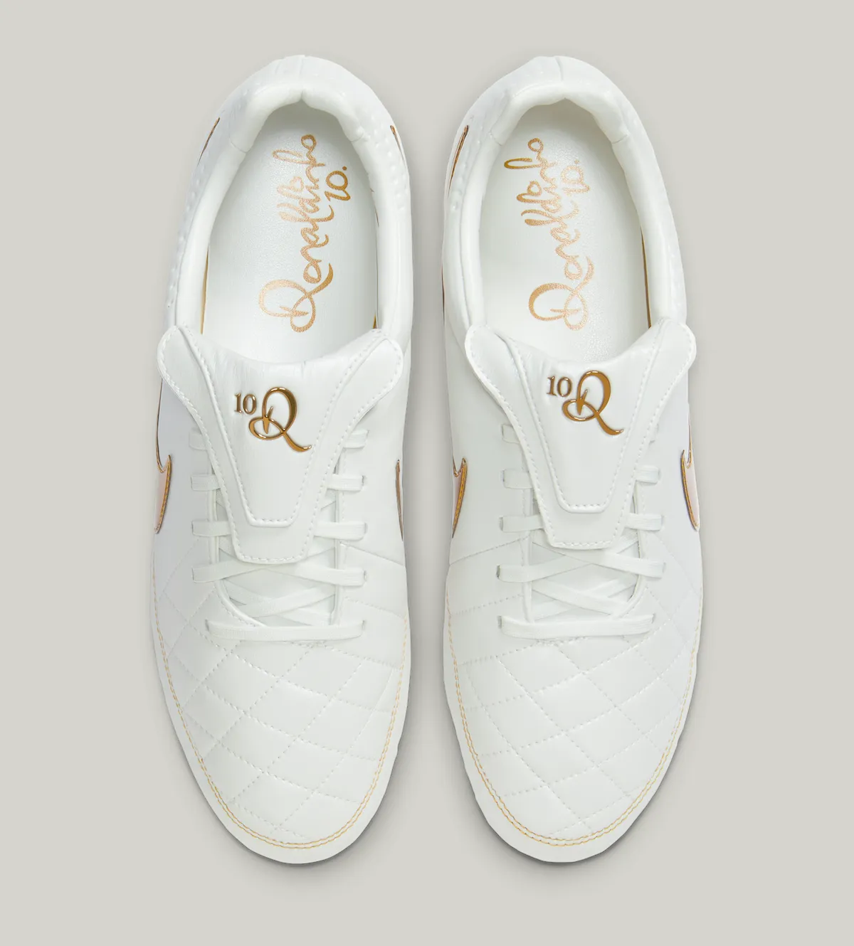 Much like the original, Tiempo “Touch of Gold” features an all-white upper with exquisite golden accents and branding that honor its signature athlete, Ronaldinho. The new version includes a gradient treatment on the sole plate, transitioning from a clean white forefoot to a golden heel. Ronaldinho’s name spreads across both sole plates in the forefoot and his signature R10 logo appears on the classic Tiempo tongue.