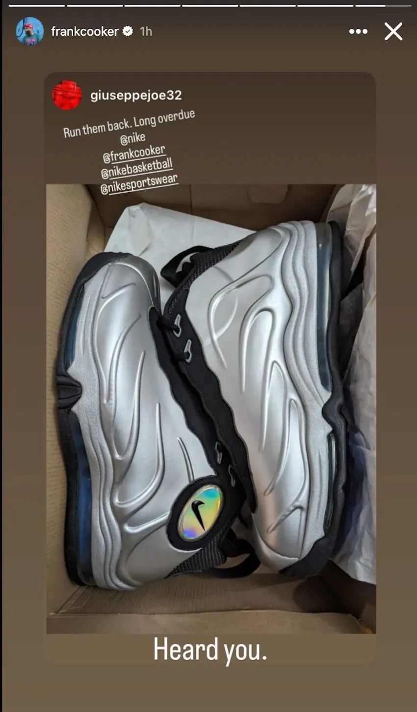 The Nike Total Air Foamposite Max might really be coming back in 2026, and this update feels way more legit than the usual leak chatter. Earlier today, Frank Cooke shared a shot of the shoe’s oval logo on Instagram, and fans jumped on it instantly. Instead of brushing it off, he dropped a simple “Heard You,” which he only uses when something is actually happening behind the scenes. Not long after, he doubled back in the comments—basically confirming to the community that this wasn’t just another empty rumor.