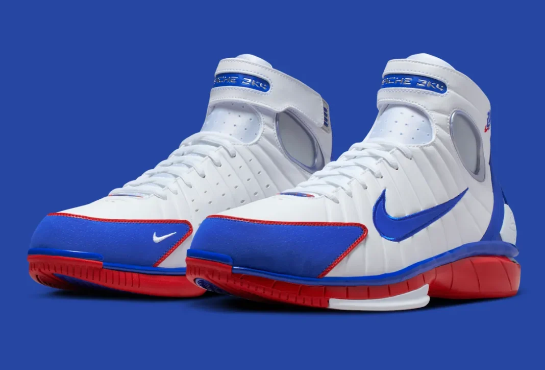 Built by Eric Avar, the silhouette blends cues from the Air Force 1, Flight Huarache, and Zoom Hyperflight into something unmistakably of its time. Smooth white leather anchors the upper, while Varsity Royal and Varsity Red accents give the pair its unmistakable patriotic character. A visible Zoom Air window underfoot keeps the performance intent intact, even as nostalgia drives much of the demand.