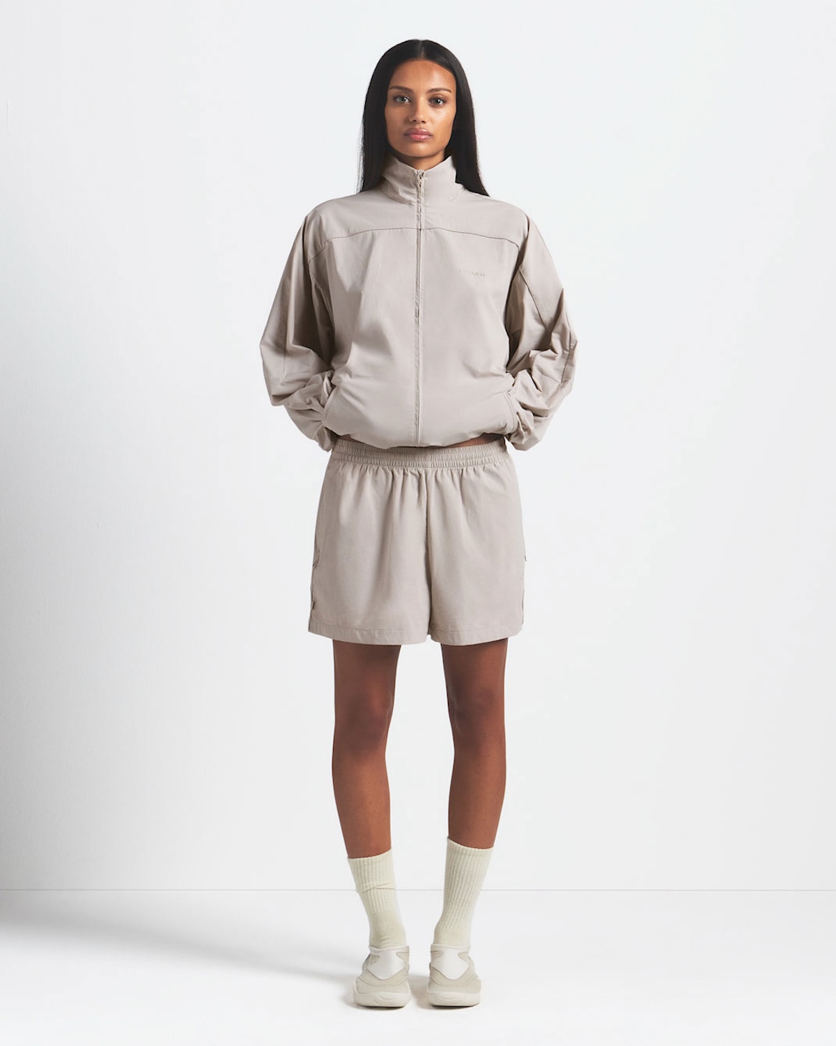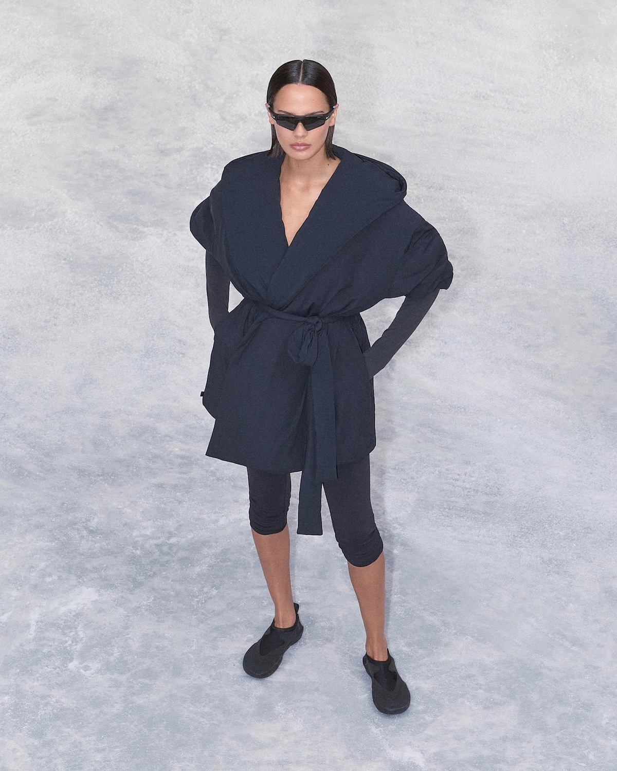SKIMS also makes a return with Shine, Matte, and Airy collections that are given a new update in the form of colorways and updated details. The Shine collection features big colorblock panels that brings vintage vibes. Matte includes staple Dri-FIT support for when you actually do work out. Airy maintains its breathability so you can move however you need to. The best part of the new collection are the new Woven Nylon pieces, including the Wrap Coat, a wearable, on-again, off-again piece you can throw on that actually works in a real, wearable rotation.