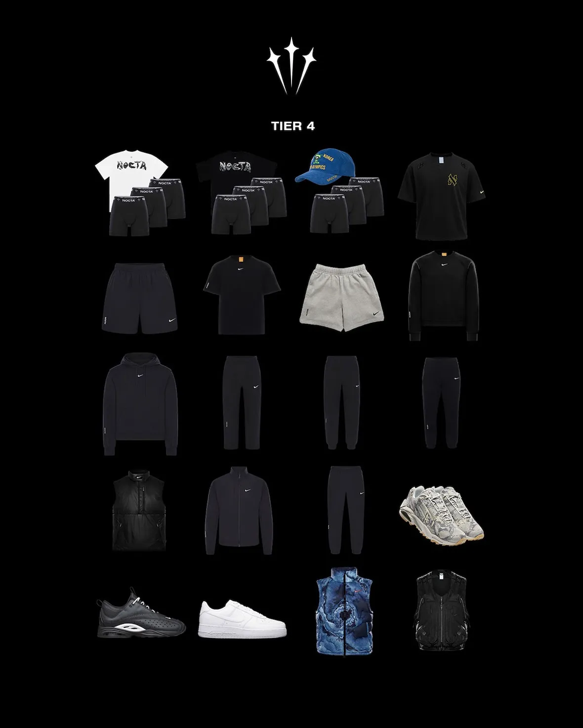 Then the ladder starts climbing. Tier 3 packs sold-out gear and older NOCTA apparel runs, including Hot Step colorways, puffer jackets, fleece, and hybrid pieces that rarely restock. Tier 2 moves into friends-and-family territory — the kind of items that usually stay locked away. Think EYBL Glides, Kentucky pairs, tactical vests, and accessories tied to Drake’s circle.