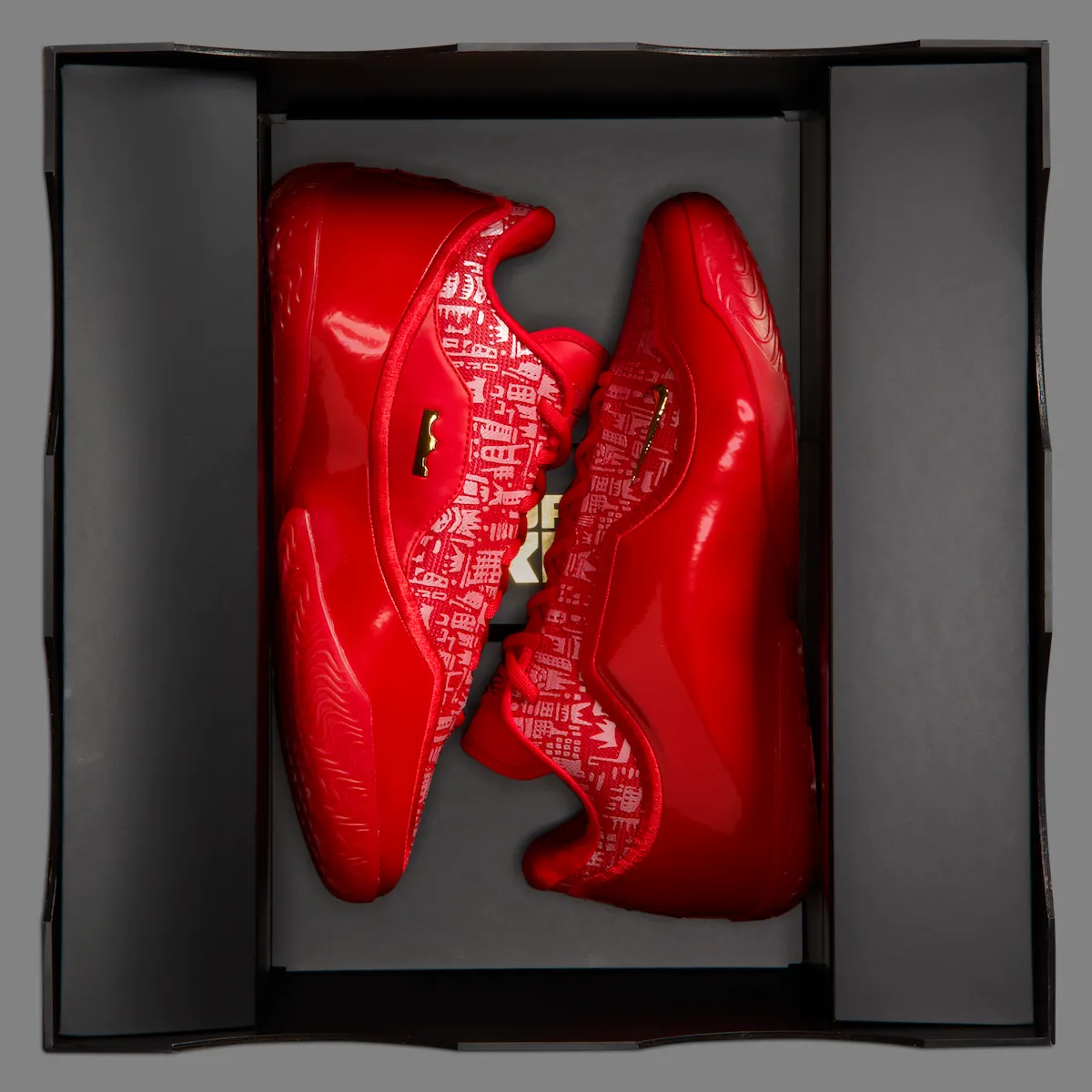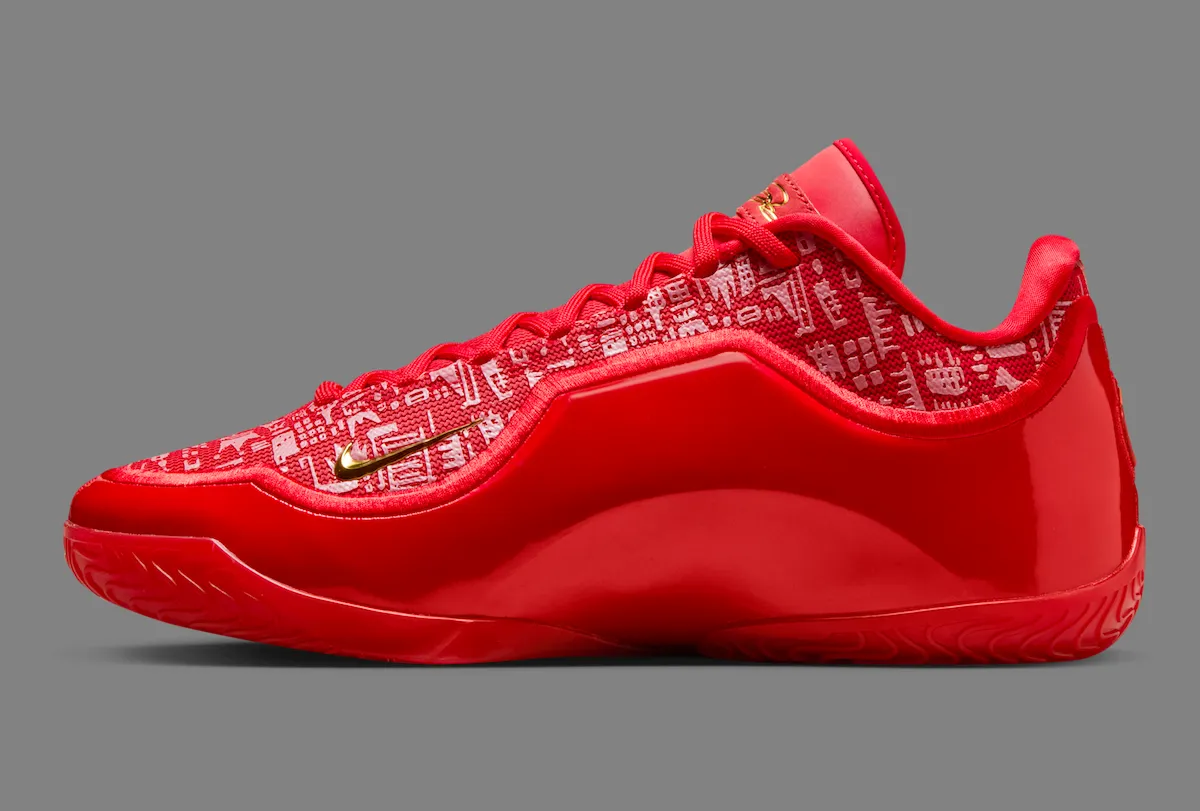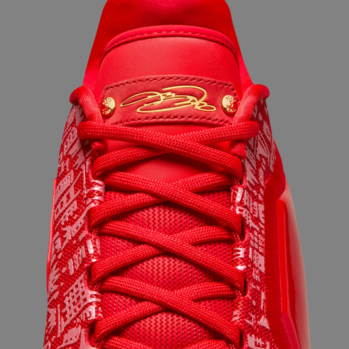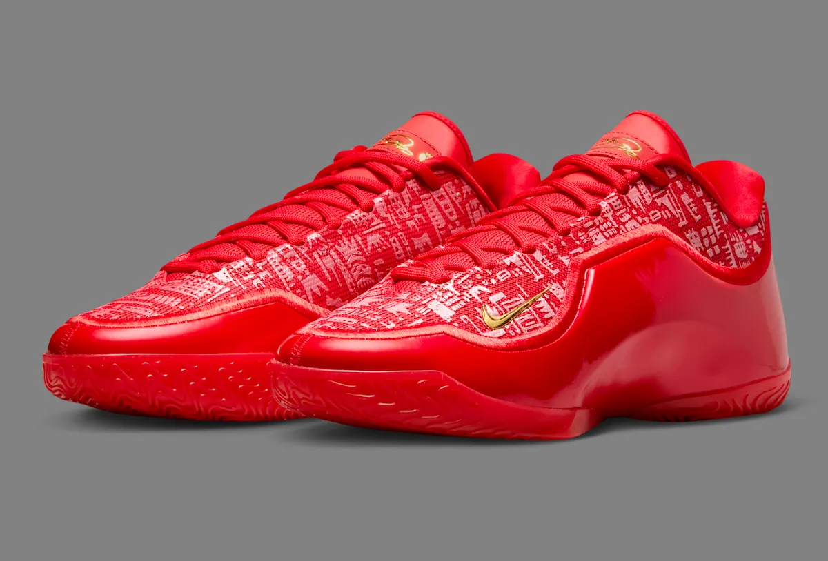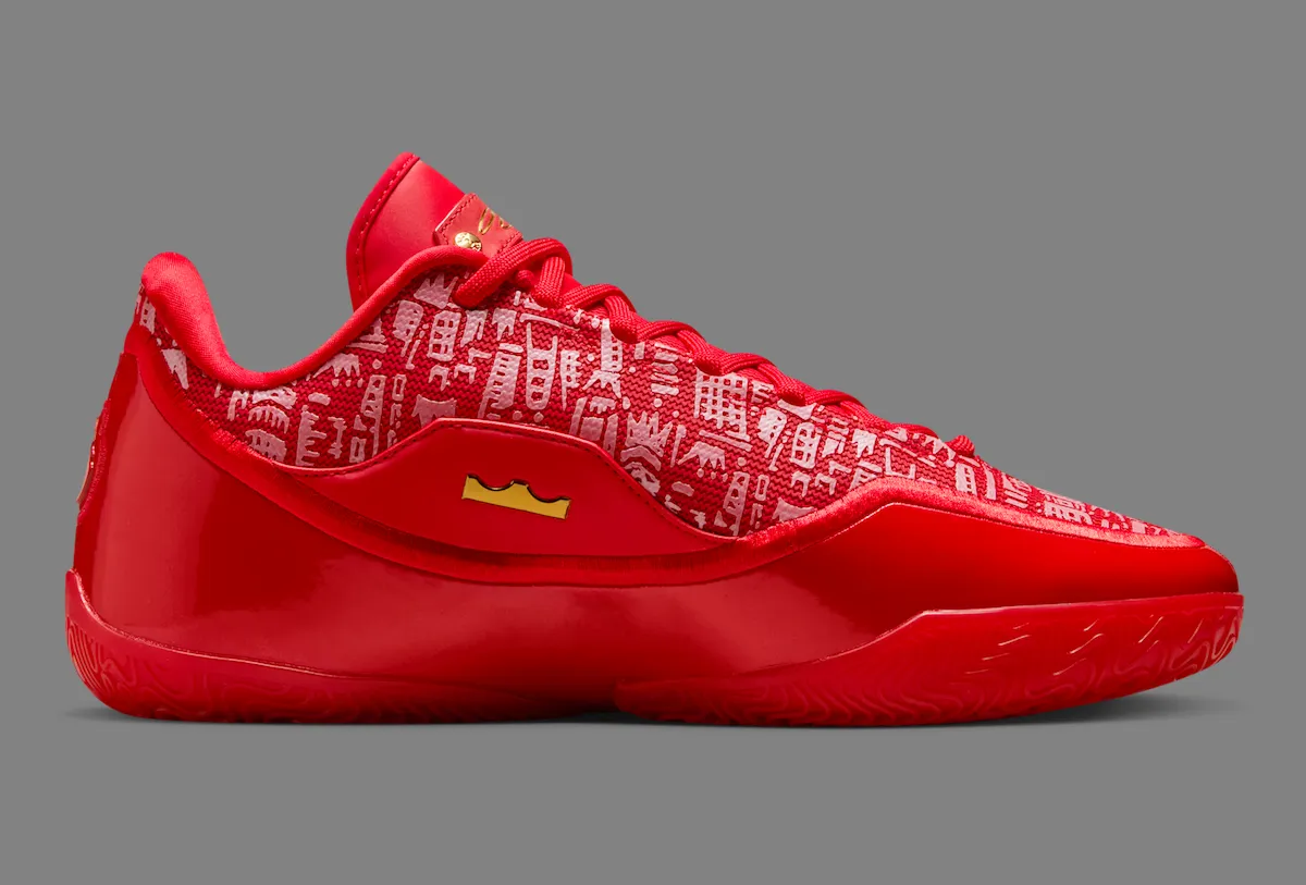 The colorway speaks volumes. Dressed entirely in University Red, the sneaker features intricate reflective graphics inspired by LeBron’s career milestones. The hand-drawn crown design is a tribute to his “King James” nickname, while the bitten apple logo on the heel is a reference to New York, also known as the “Big Apple,” where James was drafted and changed the course of his career. Gold accents on the Swoosh and LeBron’s signature on the tongue add a luxurious touch befitting of a king.