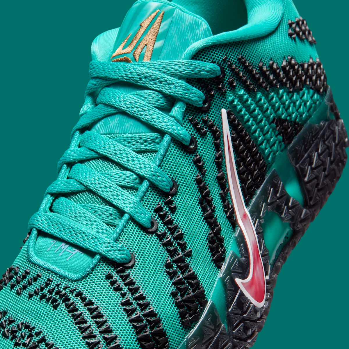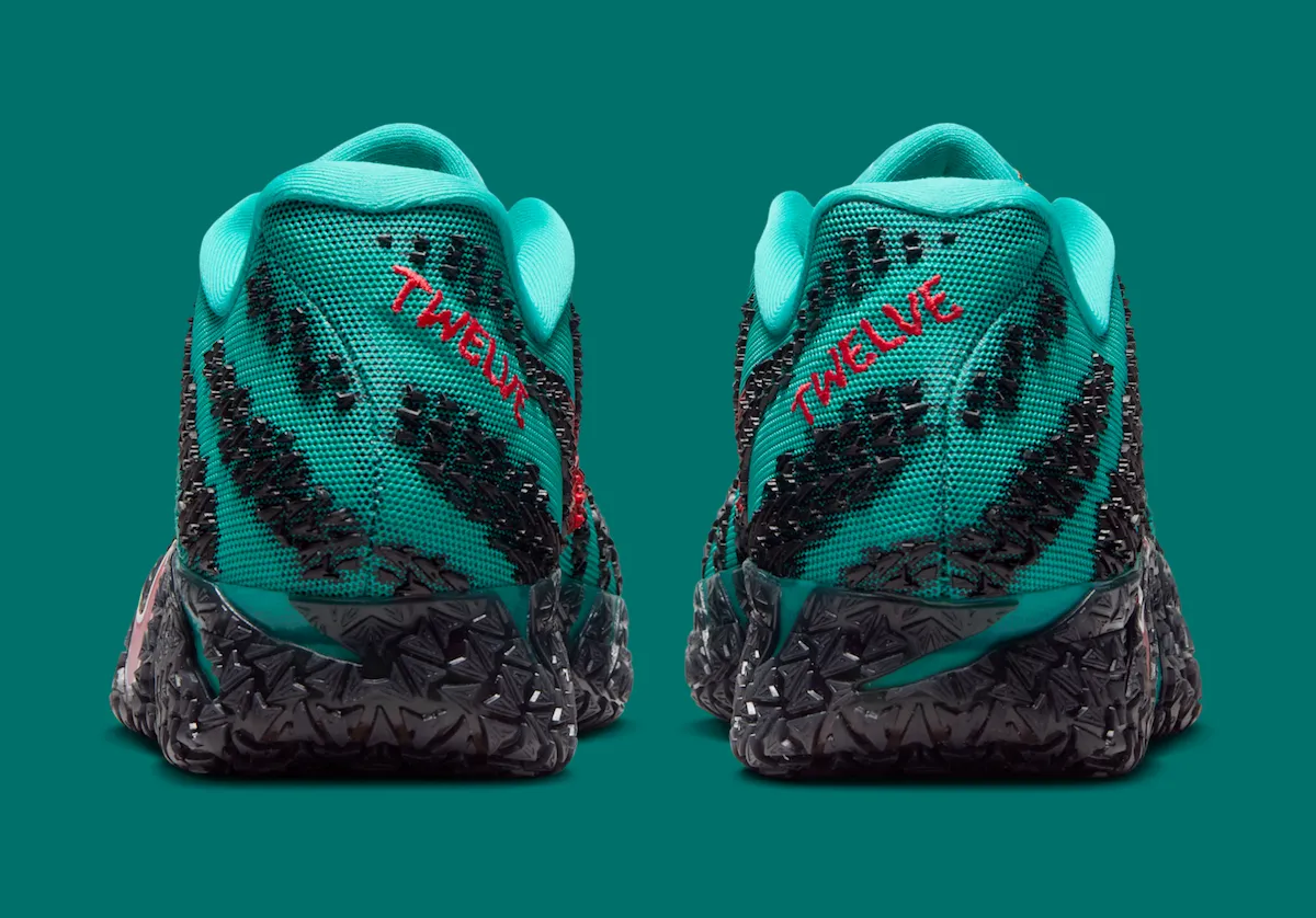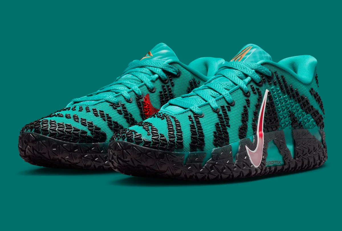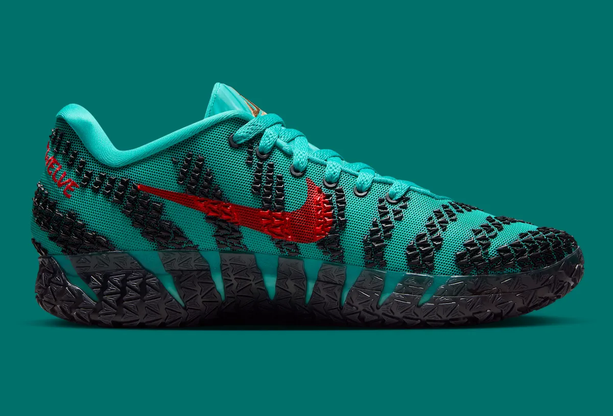 The primary hue of the upper is Turbo Green, with textured logo graphics in black scattered throughout. The side and outsole are both wrapped in a contrasting University Red Swoosh for visual pop. Matching red embroidery on the heel reads “TWELVE,” a reference to Morant’s jersey number.