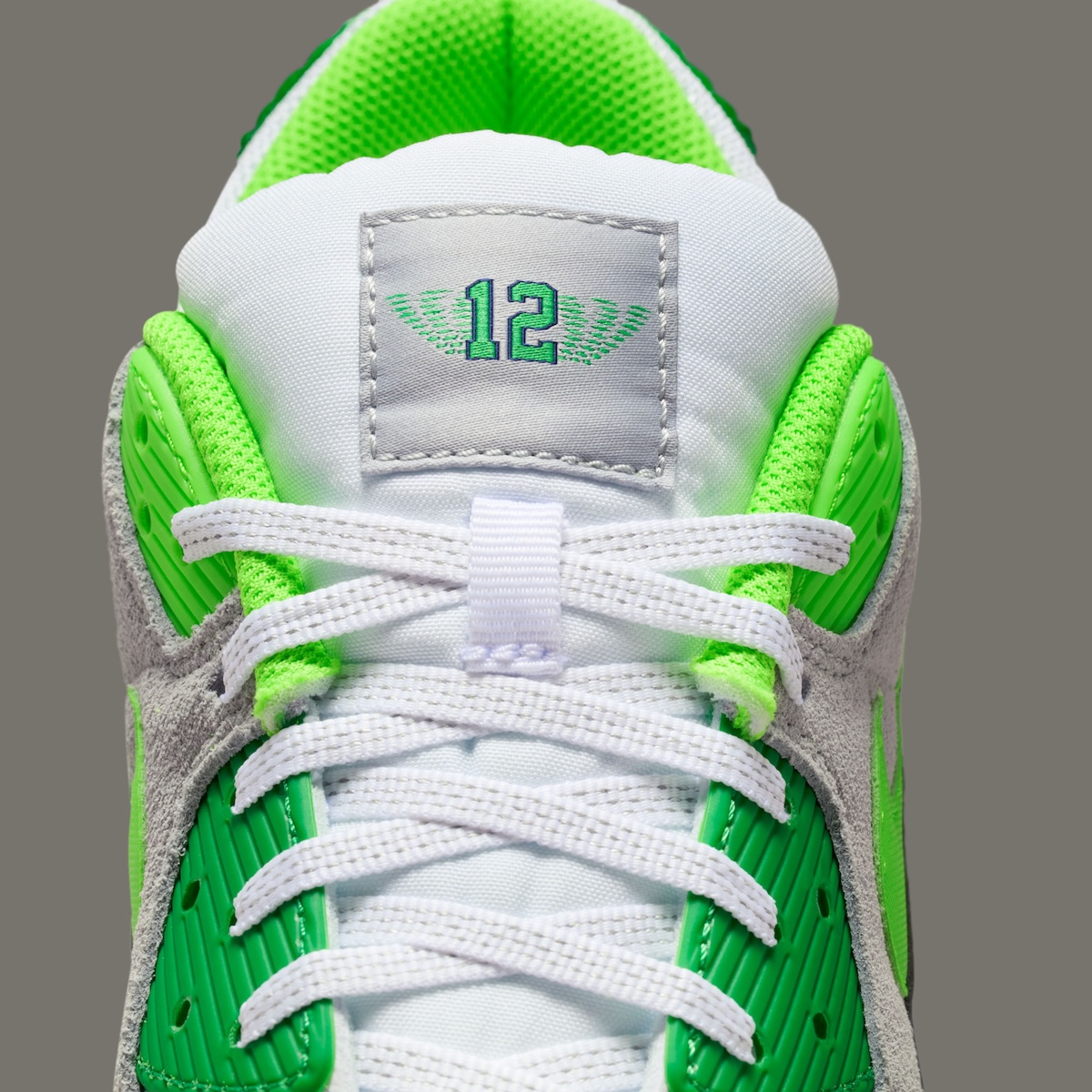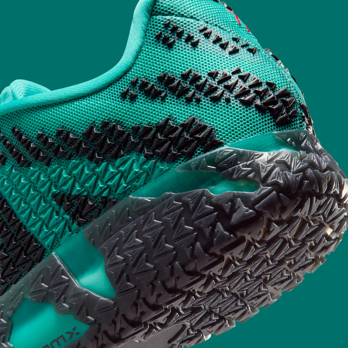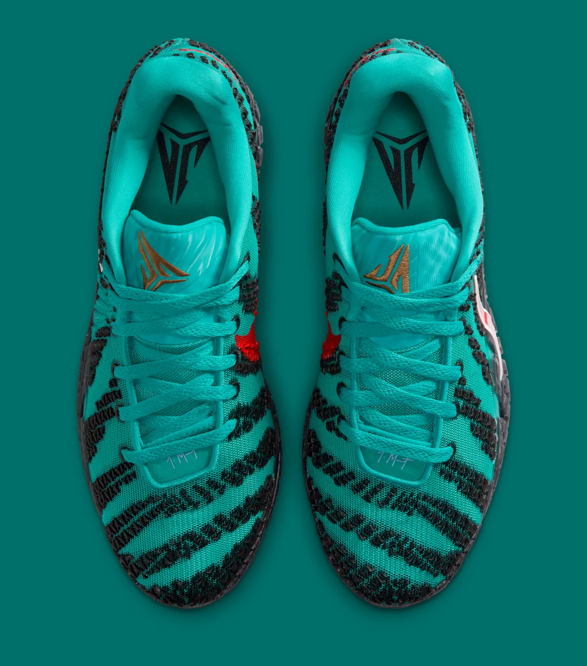 The primary hue of the upper is Turbo Green, with textured logo graphics in black scattered throughout. The side and outsole are both wrapped in a contrasting University Red Swoosh for visual pop. Matching red embroidery on the heel reads “TWELVE,” a reference to Morant’s jersey number.