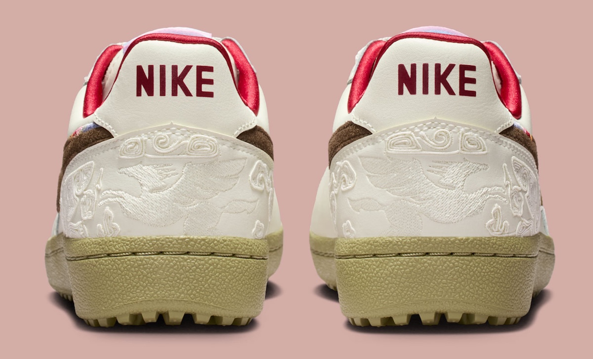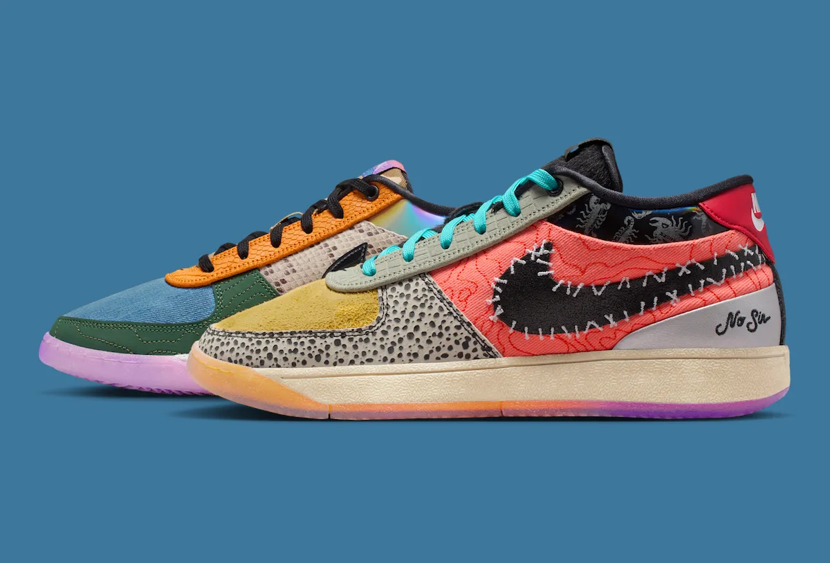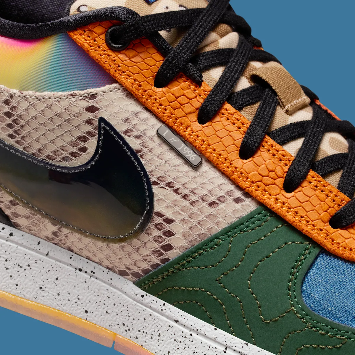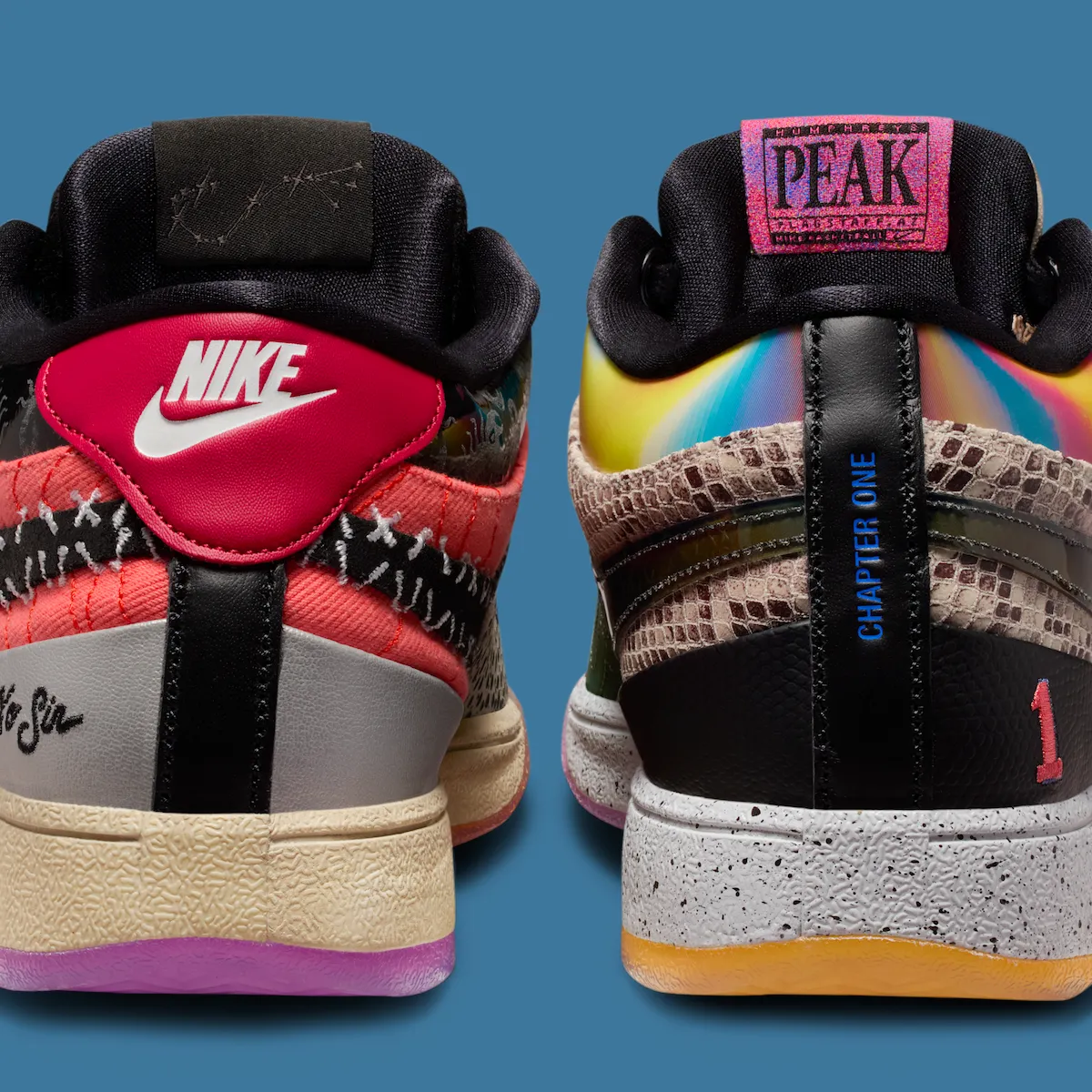 The left shoe pulls details from Safari mudguards, Chevy-inspired golden suede toes, Sedona graphics, reptile textures, and Halloween stitching. It even features nods to the ’95 All-Star laces, “Moss Point” lettering, and a Sunset outsole. The right shoe carries denim panels from “Blue Blood,” Flagstaff map prints, Desert Camo tongues, rainbow collars, and snakeskin overlays, all tied together with a “1 of 1996” heel tag. That’s the detail collectors will remember most.
