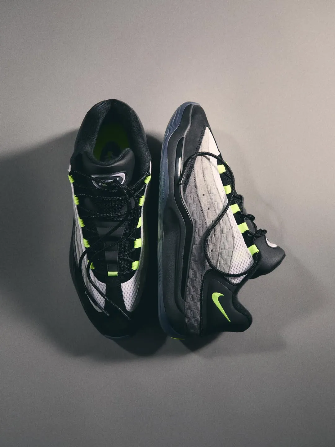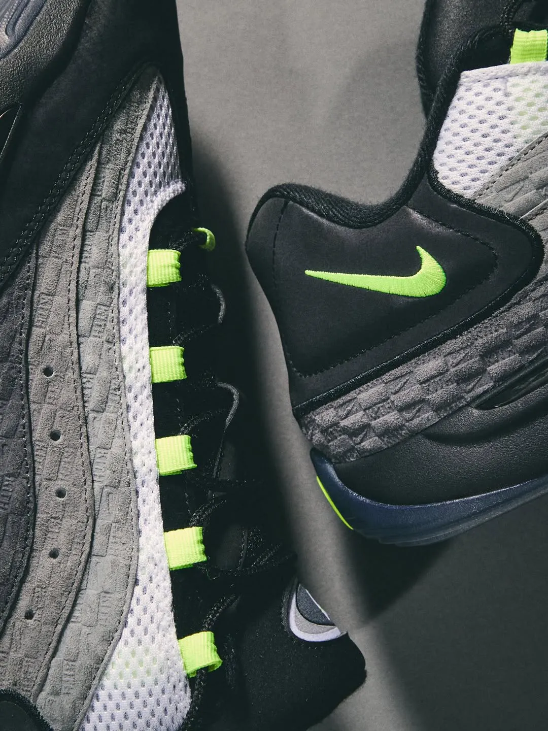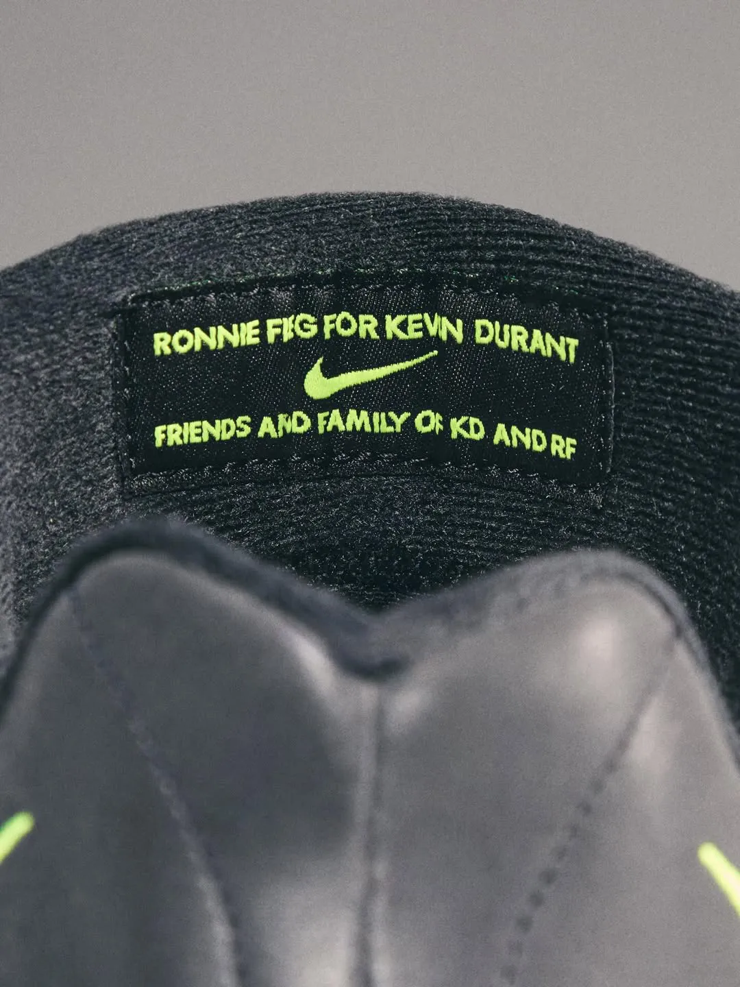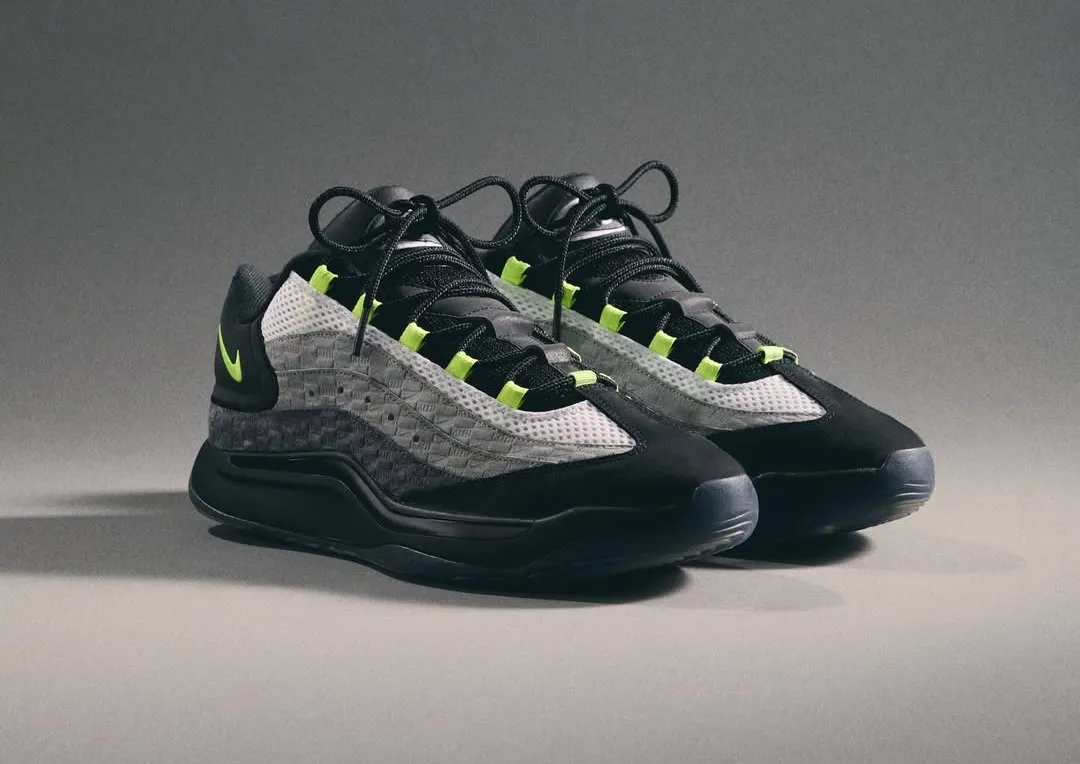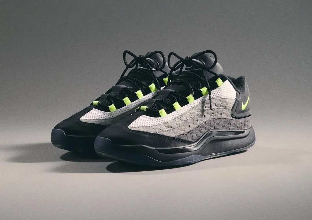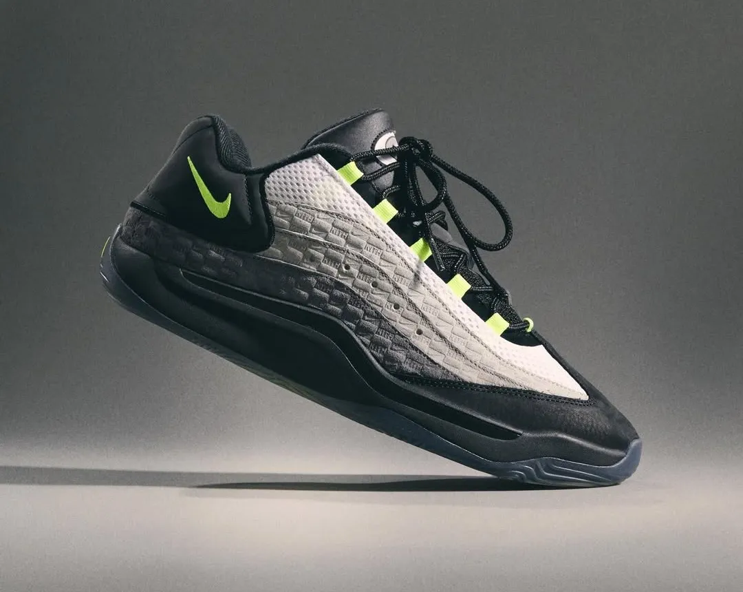 Clean white leather forms the base, while matte black overlays frame the toe, eyestays, and collar in a way that echoes classic 1985 blocking without mimicking it. Exposed zigzag stitching along the collar and heel introduces Union’s signature hand-touched aesthetic, adding texture without disrupting the silhouette’s balance. A small Fragment lightning bolt on the heel quietly anchors the collaboration rather than shouting it.