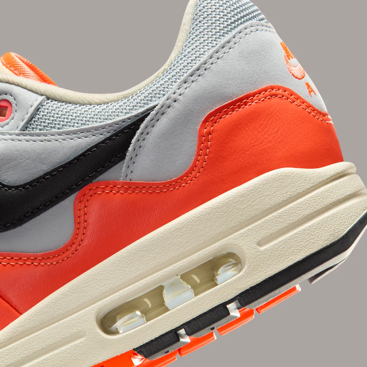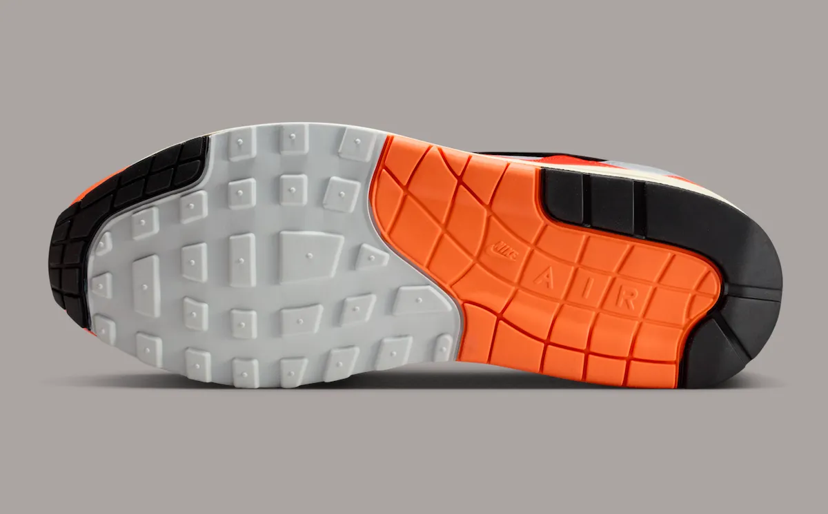 The “Hyper Crimson” pair leads the pack, featuring the recognizable wavy mudguard dressed in a vibrant orange tone that contrasts against a mix of neutral greys. A black Swoosh adds sharp definition along the side, while the layered upper keeps the classic Air Max 1 structure intact with a more modern edge. The color choice also ties back to Dutch heritage, giving the shoe added meaning beyond its visual appeal.