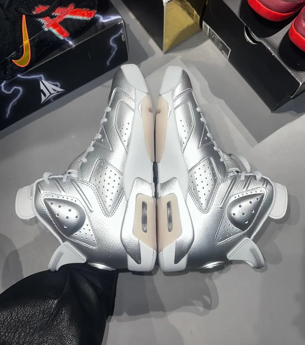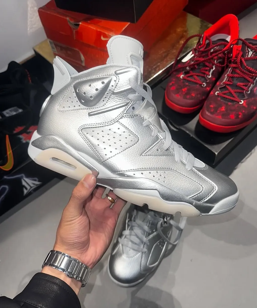 Dropping in Spring 2026, the new Air Jordan 6 PSG arrives in a dressier, metallic colorway as expected. Shiny silver leather makes up the entire upper with tonal overlays, while white and pure platinum accents and details appear throughout the midsole and heel. Finished with a sleek heel tab and clean toebox, the combination of high-end materials and classic design cues exude luxury and performance, a nod to both Parisian style and Jordan Brand’s DNA.