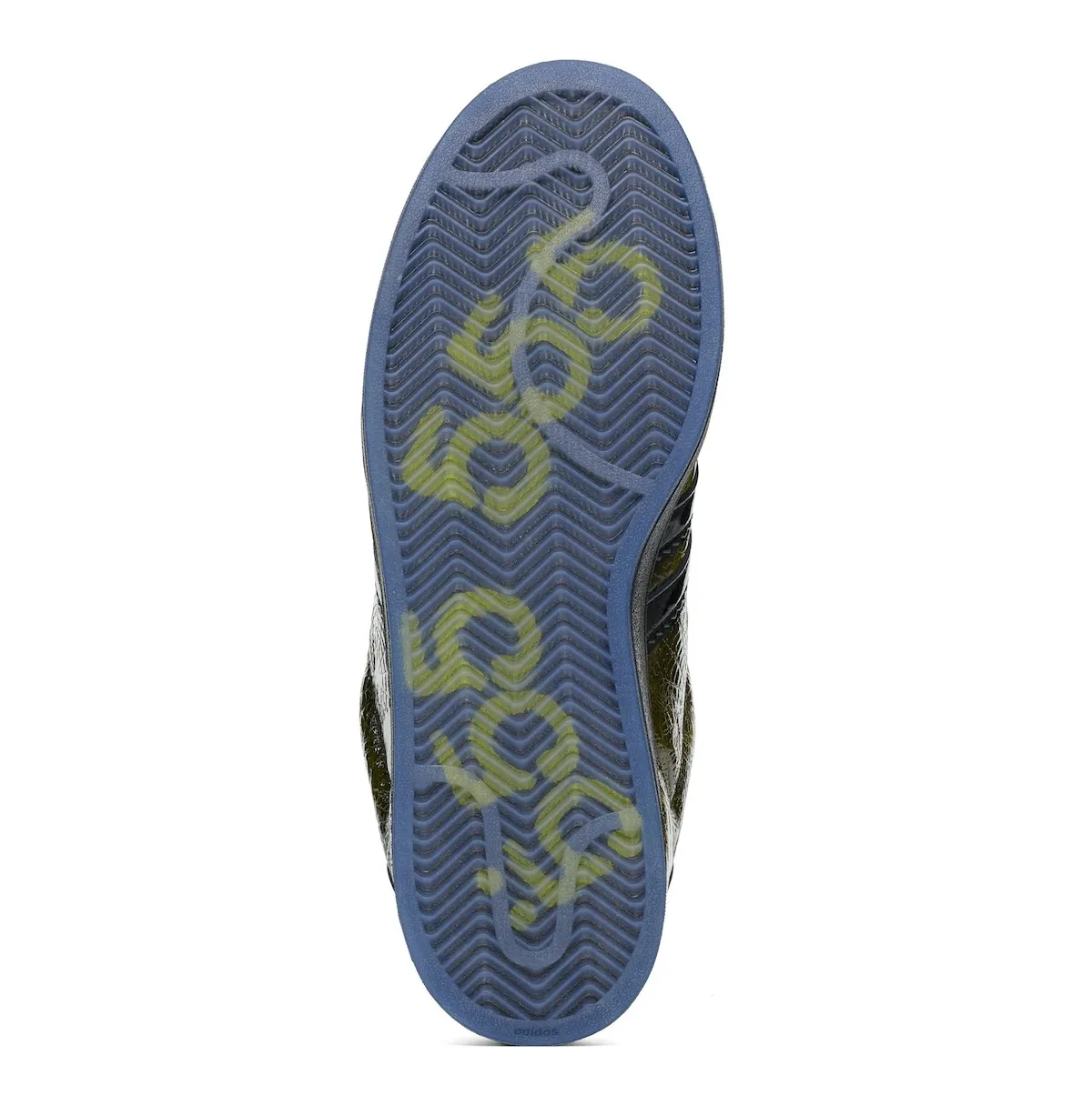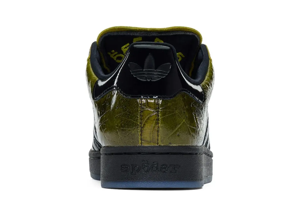 Sp5der’s influence is immediately clear. The Superstar features an olive-toned, marbled patent leather upper that feels intentionally worn and textured. Distressed web-inspired graphics stretch across the shell, while lowered black Three Stripes subtly shift the shoe’s proportions. A padded tongue adds a skate-adjacent edge, pushing the classic model into unfamiliar territory.