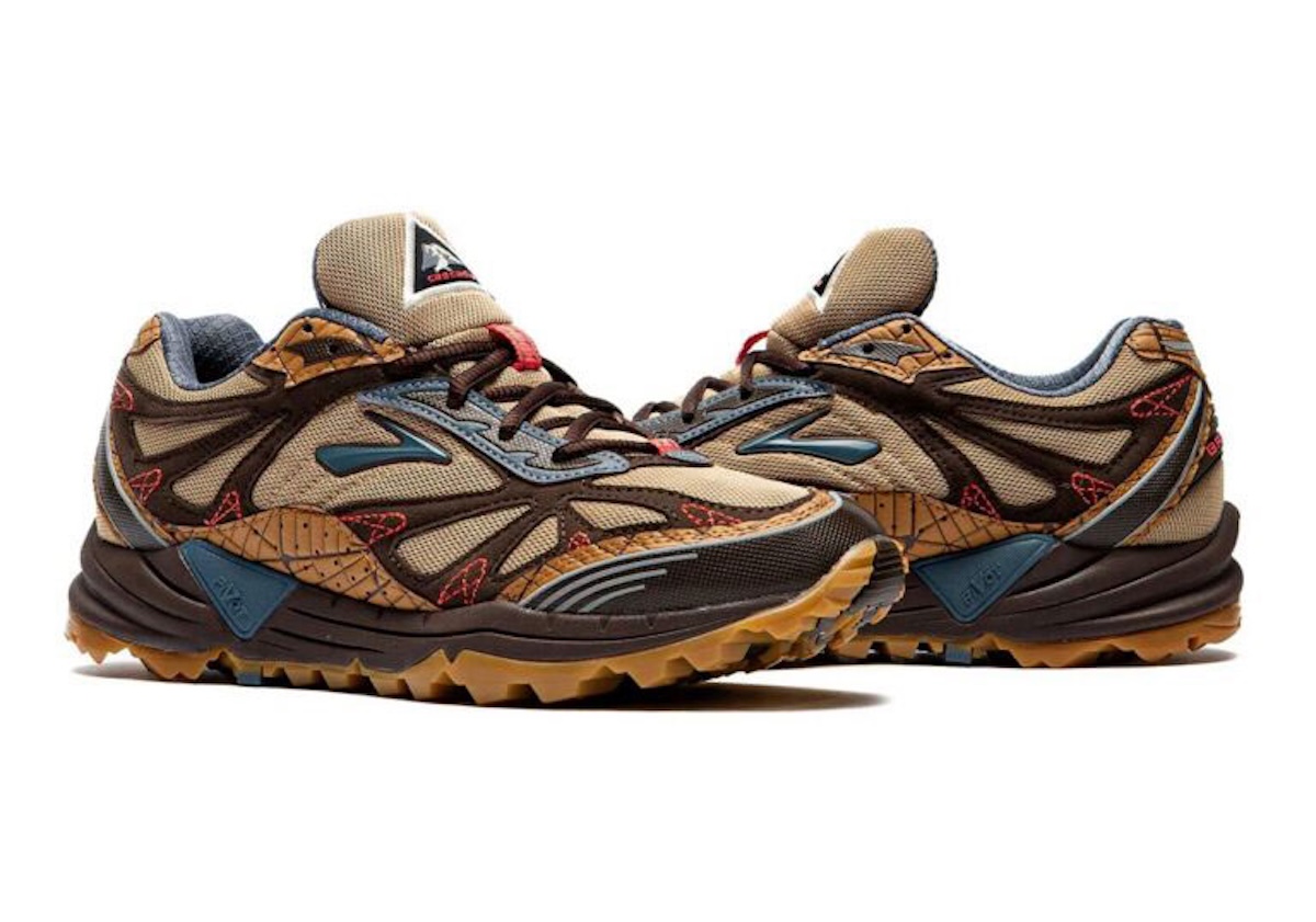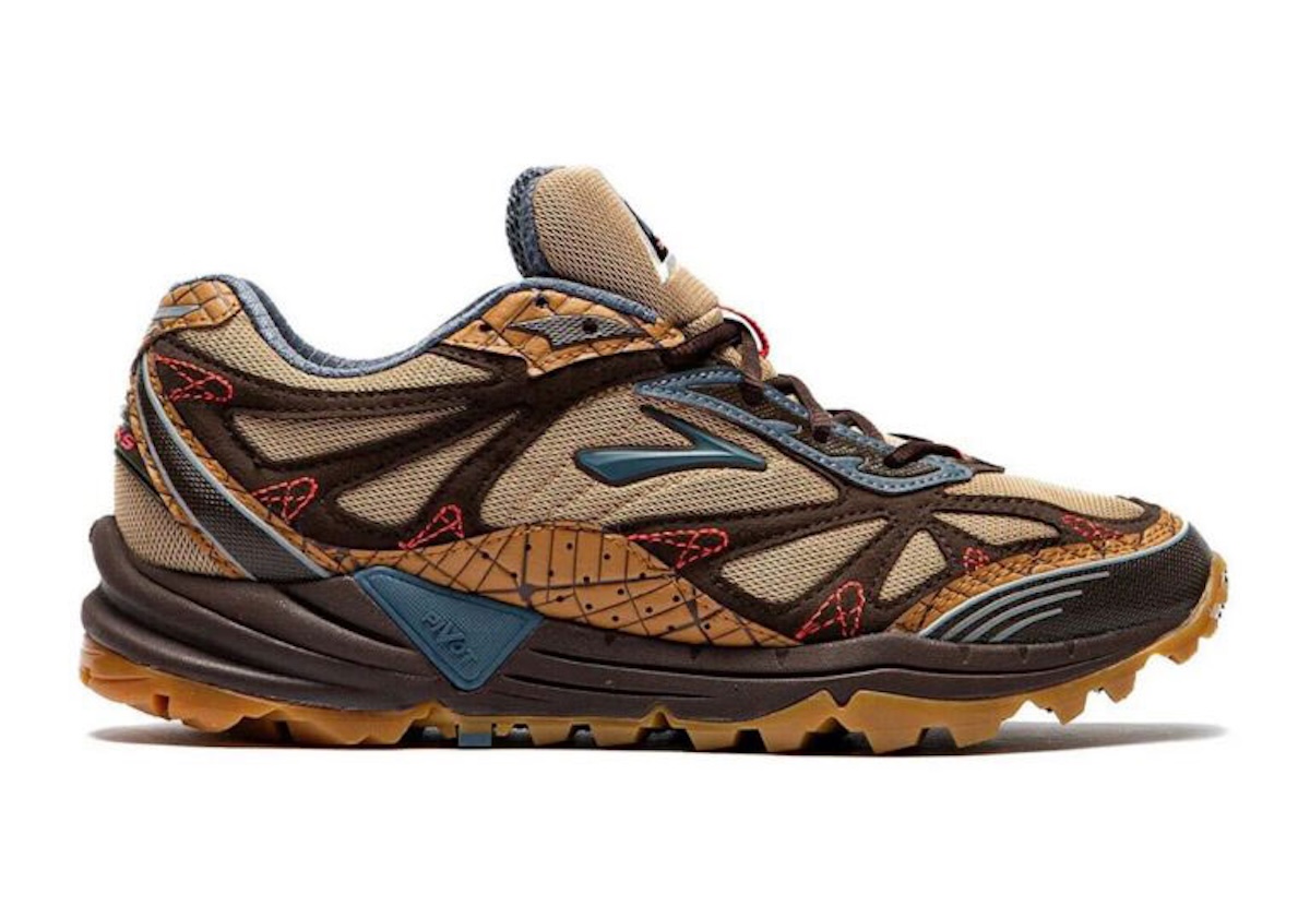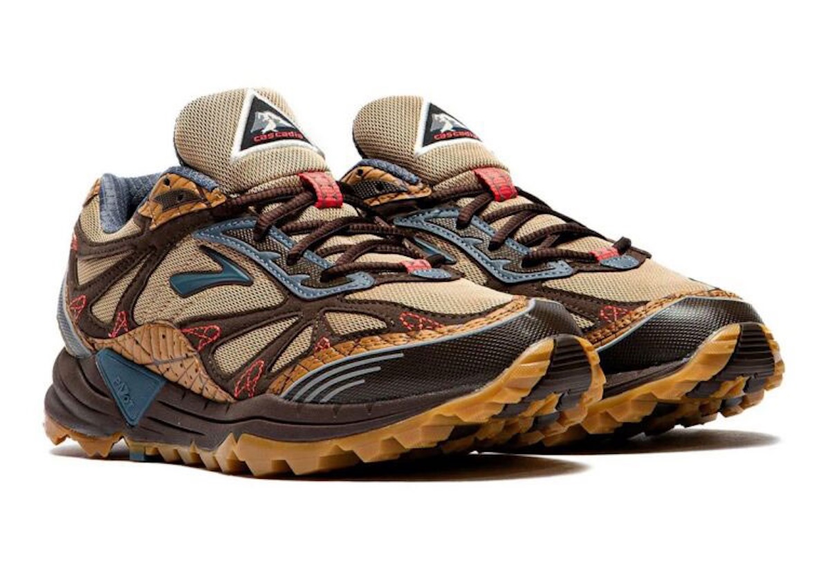 The Cascadia 1 still feels familiar, but isn’t covered in dust. Light brown mesh lives under darker suede and nubuck patterns along the midsole, heel tab, and collar. Red stitches and laces help draw contrast while a gum outsole keeps some trail DNA in the equation. The shoe’s leather even includes a hidden map of New York City stitched in subtly off-kilter lines, ground in Staple’s city.